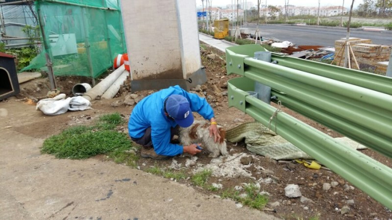 마을의 귤 하우스 문이 열려 있어 안에 들어가 보는 행운을 안았다. 귤꽃을 따는지 아니면 수정을 하는지 한창 일하고 계셔서 방해가 될까 봐 조용히 살피다 나왔다. 노지 귤은 이제 꽃망울이 생기는 중인데 하우스 귤은 벌써 하얗게 피고 있다. 수정을 위해 하우스 주변에는 벌통에 벌이 왱왱거리며 여행객을 위협했다. 여행자가 낯설었는지 하우스 안의 거위가 꽥꽥거리며 펜이 눈치를 본다. '괜찮아' 하며 우쭈쭈 시늉을 해주는 데도 슬슬 피한다. 귤 하우스를 뒤로하고 강정마을을 가는데 길에서 애견 미용이 한창이다. 주인의 애정이 묻어 나온다.