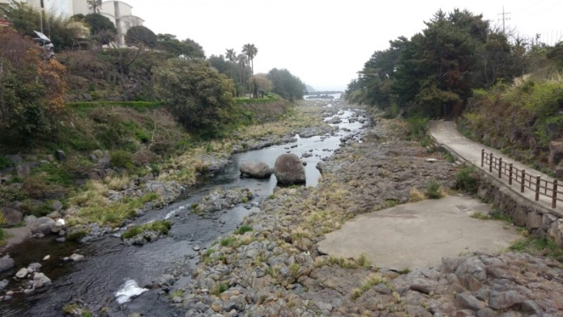 약근교를 건너 컨싱턴 리조트를 오른쪽으로 휘감고 돌아 강정천에 닿으면 리조트 방향에 주상절리대가 나타난다. 절도 있게 각진 육각형의 절리대가 신비롭다. '일강정'이란 말처럼 강정마을은 담수가 가능해서 예전에는 벼농사를 지었다고 한다. 논농사가 가능한 제주에서 몇 안 되는 지역이다. 그리고 강정천은 1급수에서만 산다는 은어의 서식지이다. 여름철에는 물이 얼음장처럼 차가워 시민이 즐겨 찾는 곳이다.