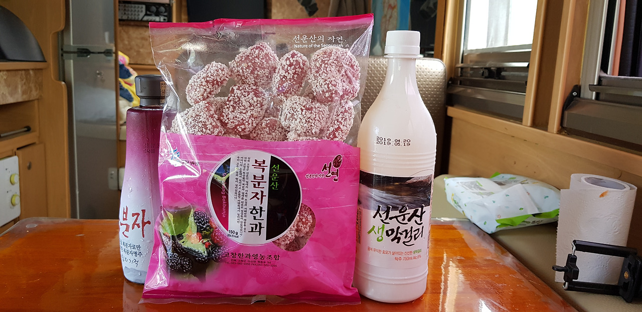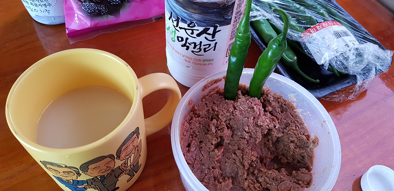 출구의 선운산농협 하나로마트에서 산 3종 세트 복분자 와인, 복분자 한과, 선운산 막걸리 두 시간의 목마름을 막걸리 한 잔으로 해소했다. 뭐가 들어갔는지 달짝지근하다. 얼큰 청양고추에 된장 찍어먹으니 세상 부러울 것이 없다.
