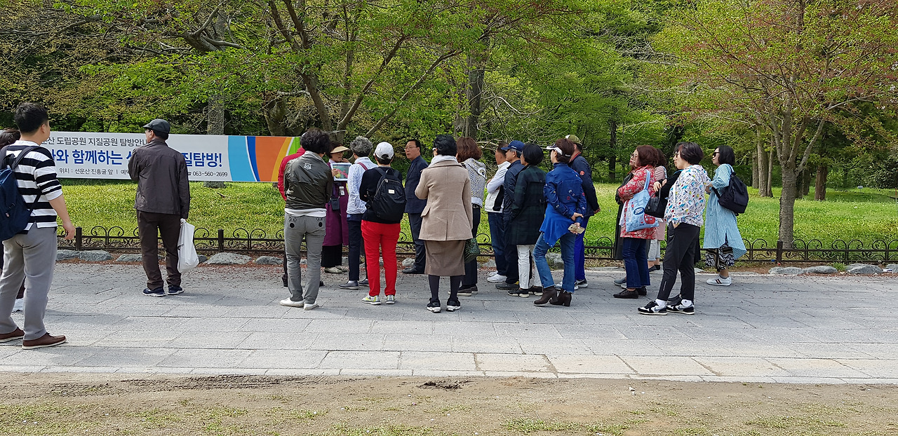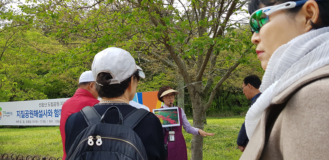 선운사 꽃무릇에 대해 열심히 설명하고 계시는 문화해설사 귀동냥으로라도 들어야 의미가 있다.