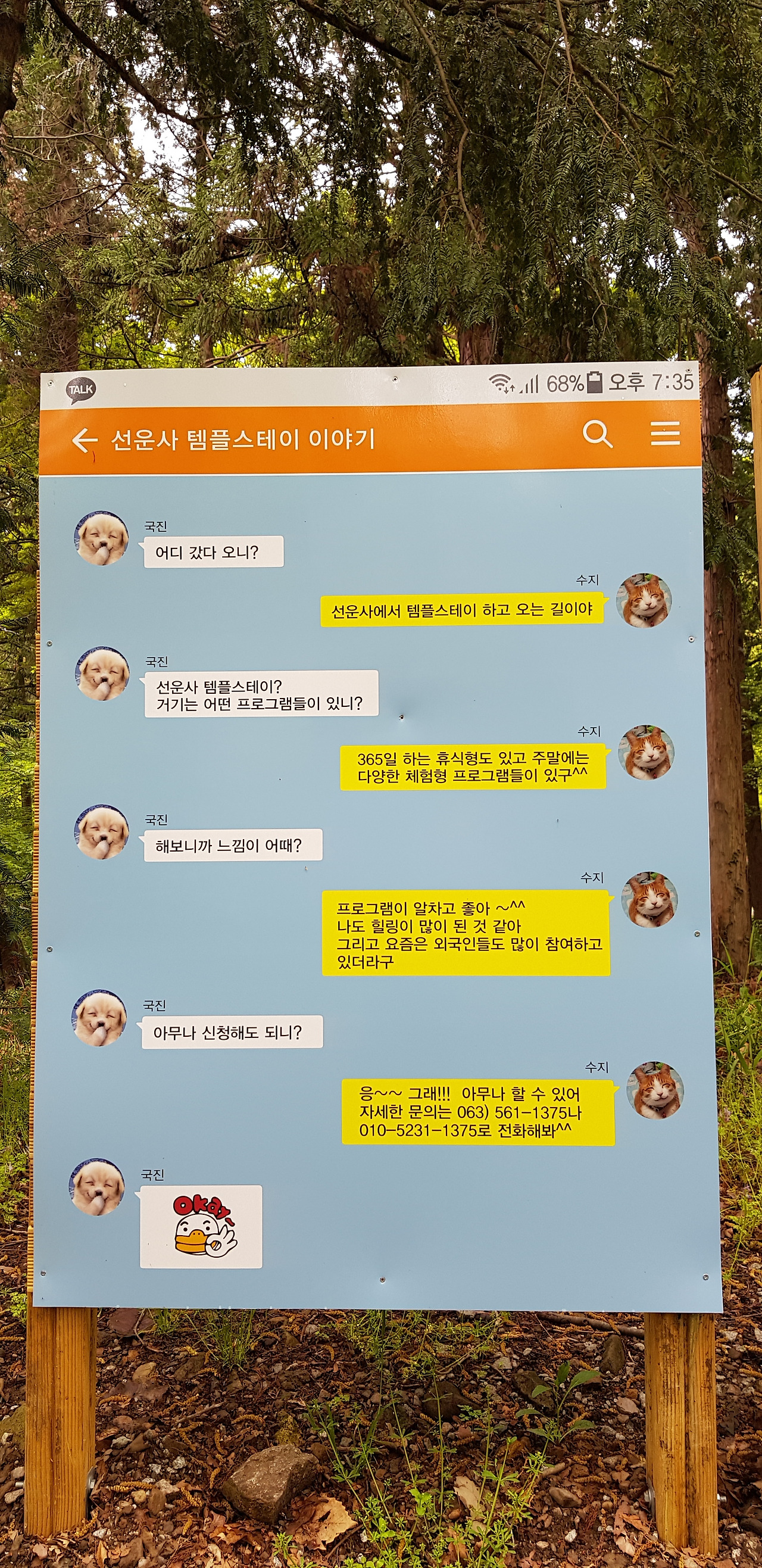 선운사 템플스테이를 알리는 안내판을 톡으로 정리했다. 연륜이 묻어나는 나무 앞으로 지나는 연등이 이채롭다.