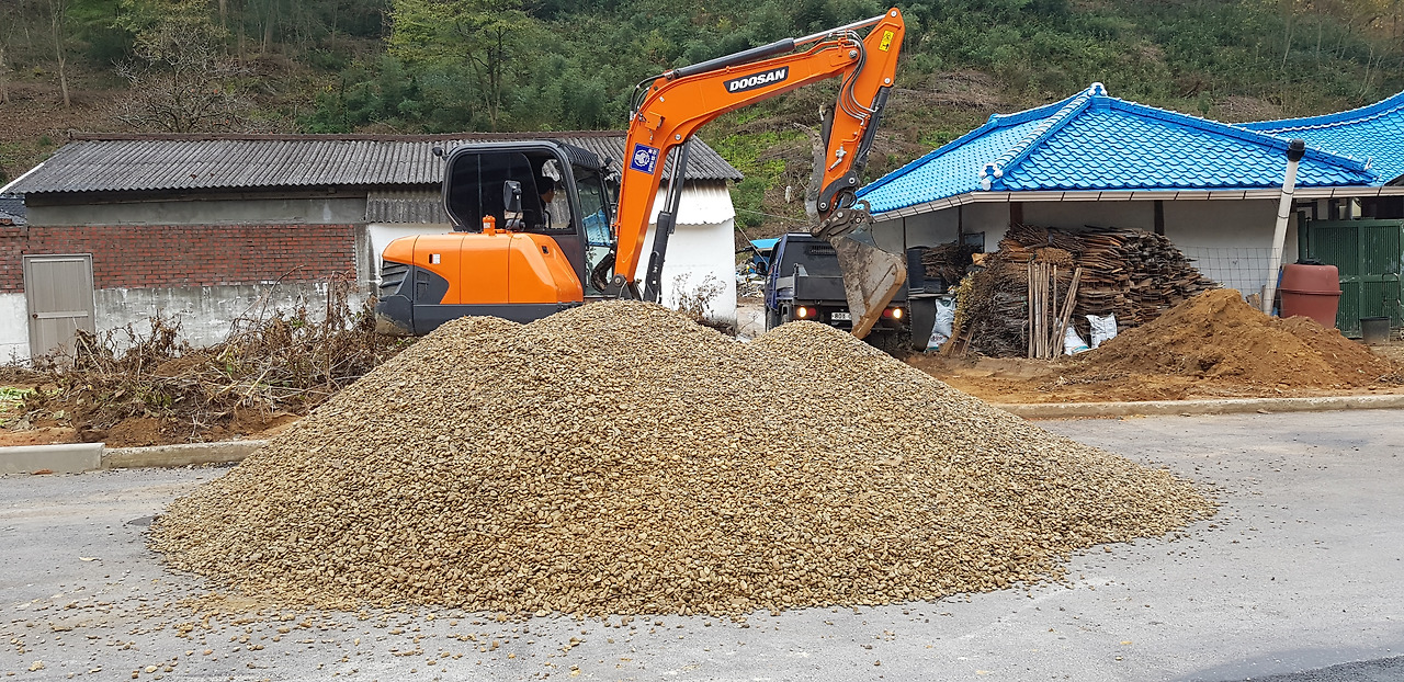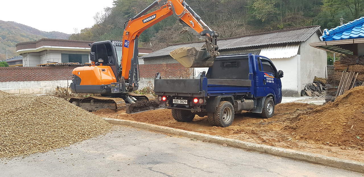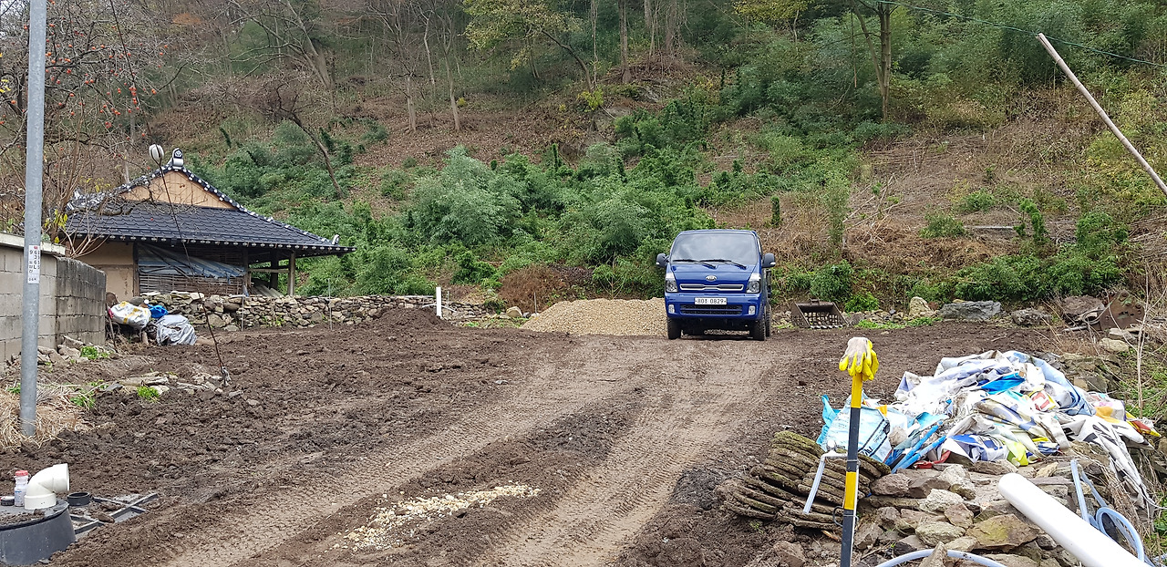 진입로가 좁아 밭주인의 양해를 구해 1톤 트럭으로 골재를 옮겼다. 이젠 이웃이 될 시골 인심이 고마웠다.