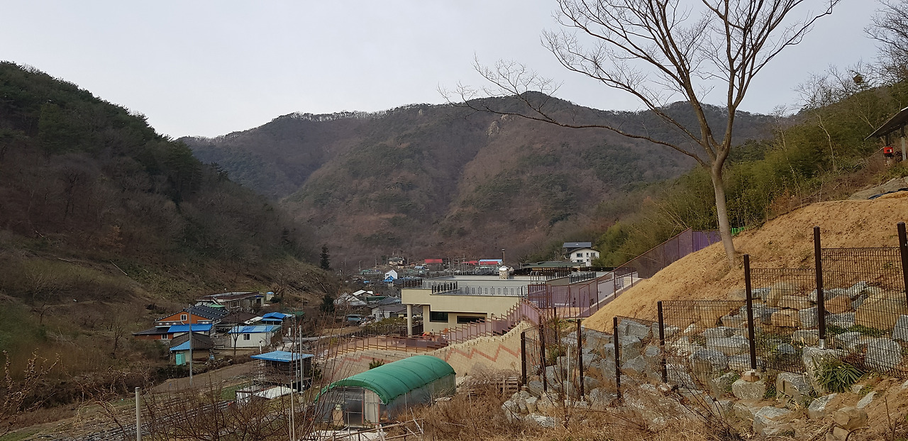 마을 아래를 내려다보니 농촌의 전통집과 현대적인 건물이 조화롭게 꾸며져 있네요.