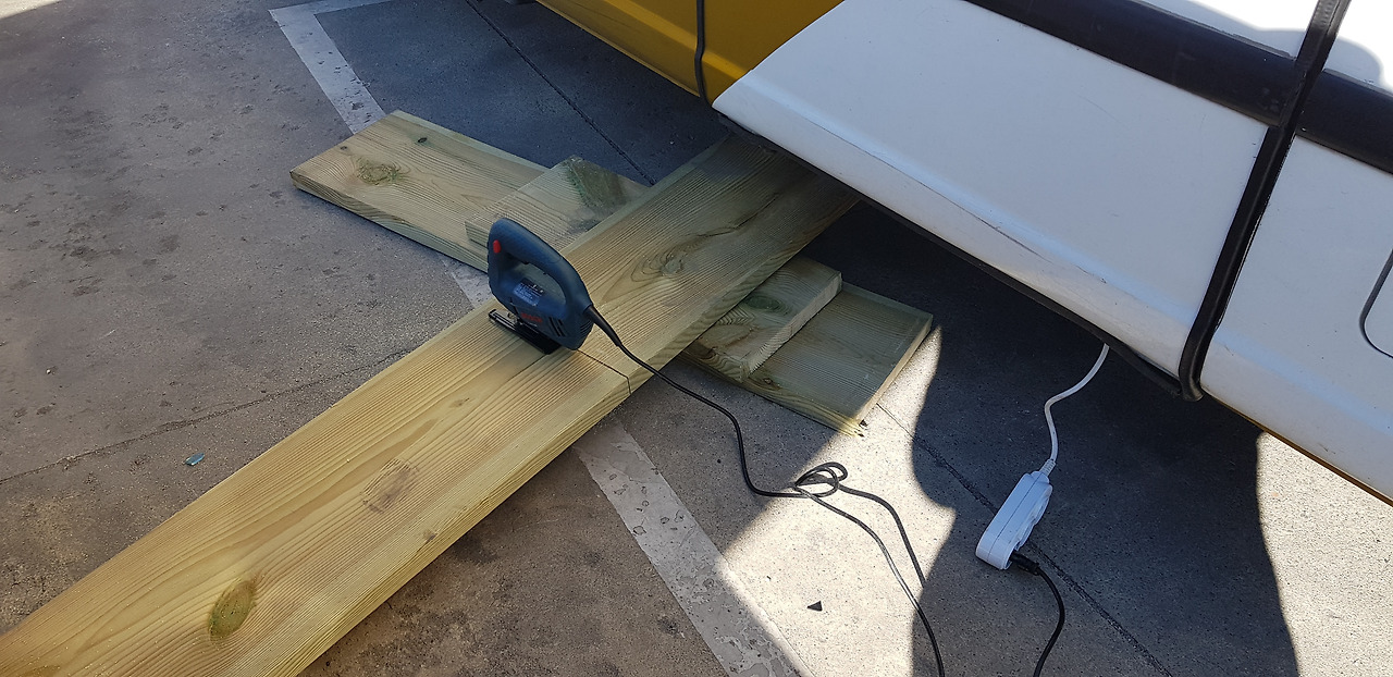 목재상에서 계단 제작용 방부재(89×285×3600mm, 장당 27,000원) 1장을 샀다. 길이가 3.6m라 칸티에 실을 수 없어 현장에서 직소기로 재단했다.