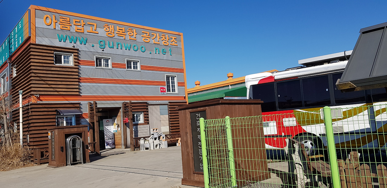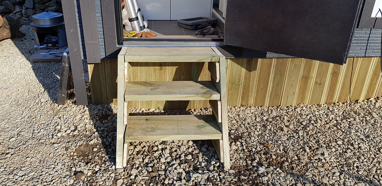이동식 주택이 30cm의 기초석 위에 떠 있어 출입에 애로가 있다. 더군다나 지면에서 현관문까지 높이가 60cm나 되니 계단이 절대적으로 필요하다.