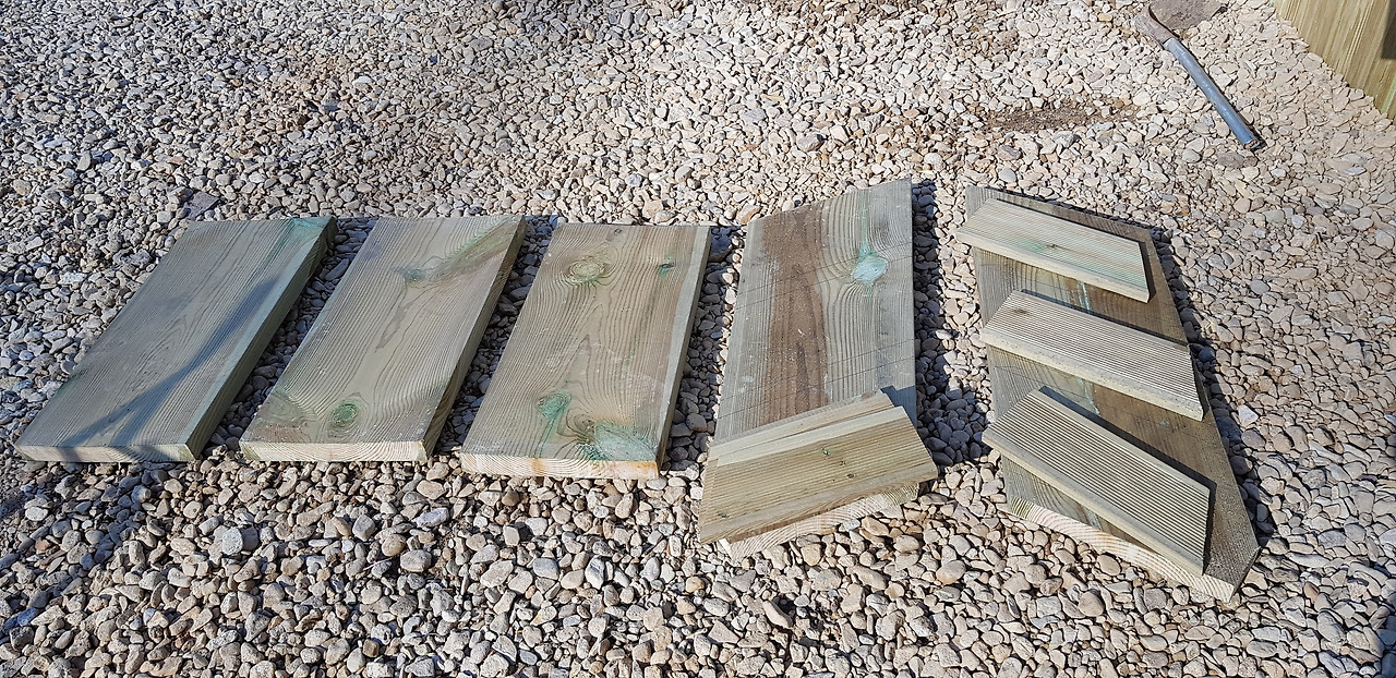 미리 필요한 치수를 계산해서 갔다. *계단 날개 : 900mm×양옆 2개=1800mm(양 끝은 30도 기울기로 150mm 절단해 계단 총길이는 750mm, 계단 높이는 600mm) *계단 : 600mm×3개=1800mm 돌아오면서 철물점에서 방부용 피스(65mm) 50개를 사려는데 봉지 단위로 판매해서 울며 겨자 먹기로 수백 개가 든 한 봉지를 샀다. 큰 피스는 건축 현장용으로 봉지를 뜯으면 낱개로 사 가는 분이 없어 어쩔 수 없다는 아줌씨의 말에 수긍이 가기도 했다.