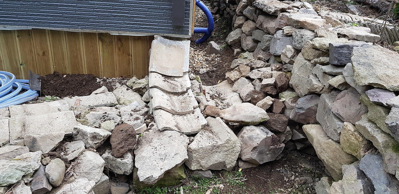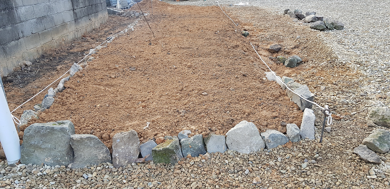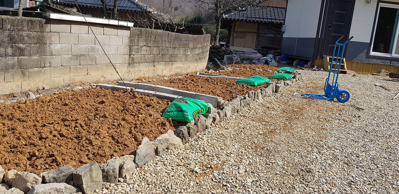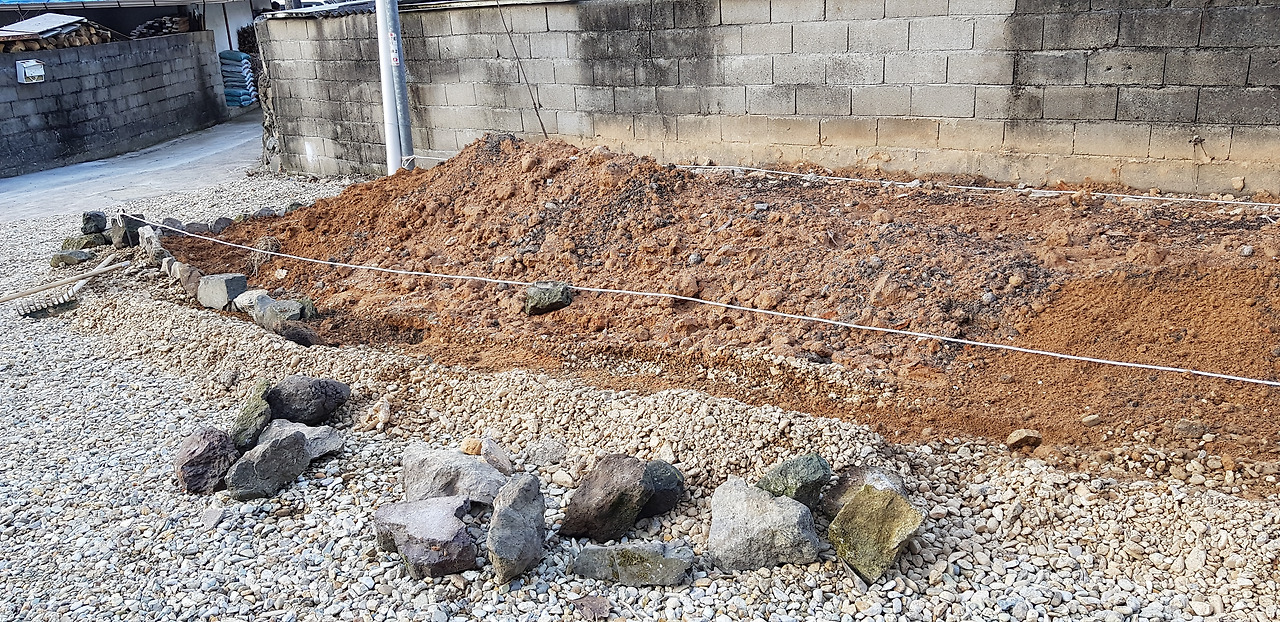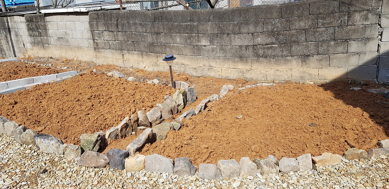 한 단으로는 약해서 두 단, 세 단으로 합니다. 초보치고는 제법 그럴듯합니다. 흙을 걷어낸 곳은 자연스레 배수로 역할을 하게 됐습니다. 또한 자갈과 흙으로 구분된 마당과 텃밭 경계를 큰 돌로 표시합니다.