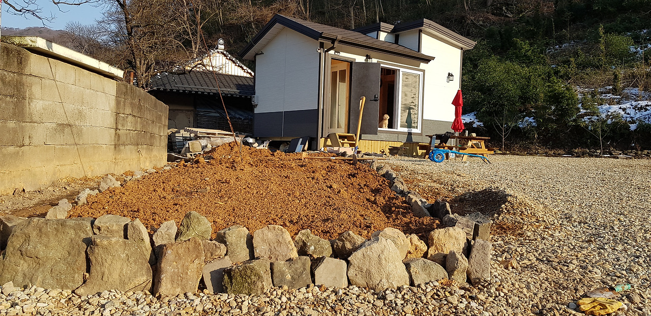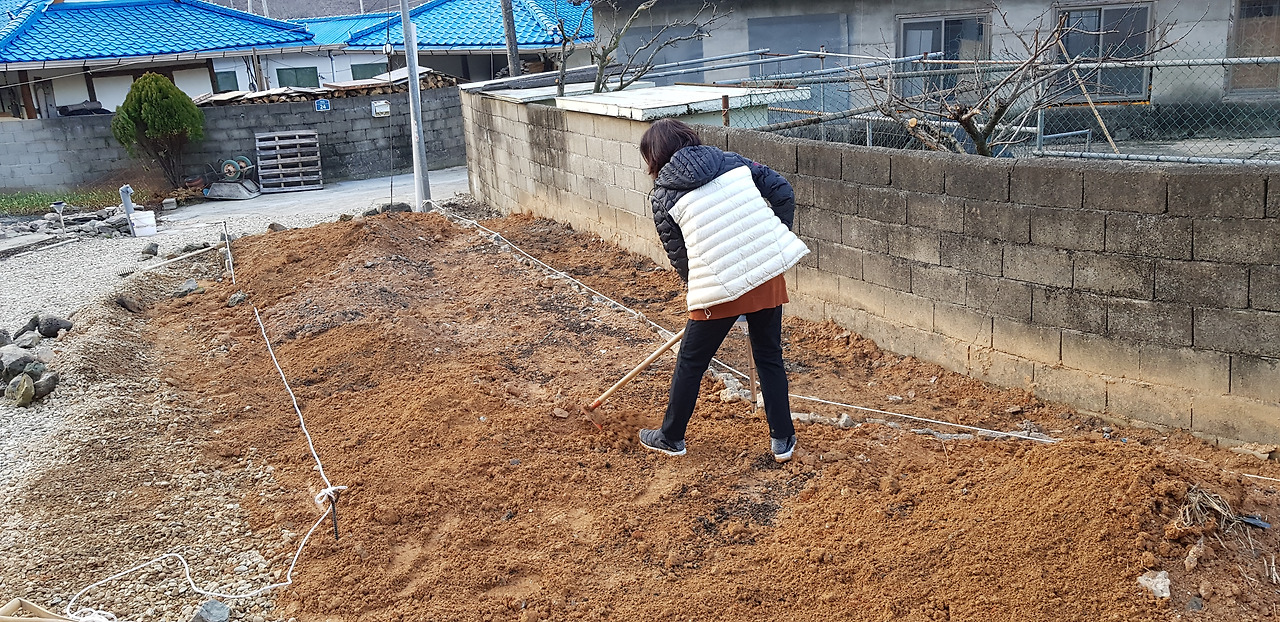 그리고 봄 파종을 위해 텃밭에 퇴비도 뿌려줍니다. 생땅이니 반드시 시비를 해줘야 하기 때문입니다.