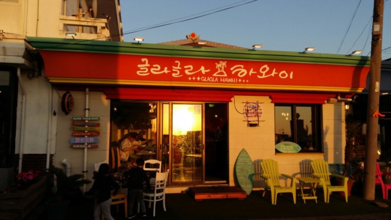 오늘 걸은 결과입니다. 어제 걸은 17.1km와 비슷한 결과입니다. 숙소에서 출발한 지 6시간 50분, 버스에서 내려 걸은 지 5시간 50분이 걸렸습니다. 숙소 옆 '글라글라하와이' 카페에서 목을 축이는데 모슬포의 일몰이 환상적입니다. 모슬포에서 4일 연박 마지막 날 일몰을 보게 돼서 다행입니다.