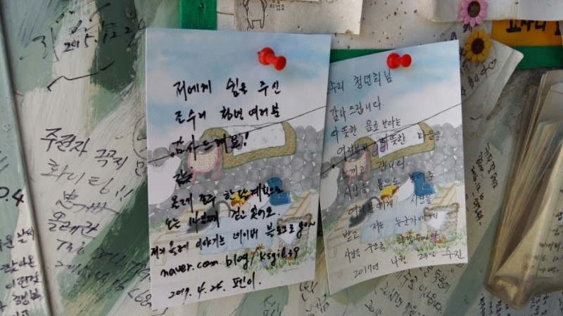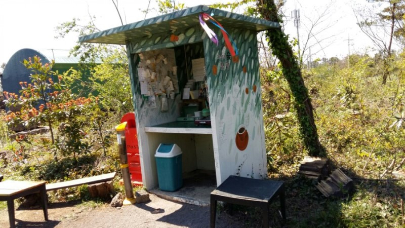 한참 아스팔트를 걷다 좌회전하니 '고사리길'이 나타난다. 고사리가 많아서일까? 그런데 고사리 캥이는 솔잎혹파리 예방 때문인지 기계톱의 굉음 소리와 벌목한 나무를 옮기는 트럭 소리만 요란스럽다. 어서 이 길을 벗어났으면 했는데 아주 조그마한 패널 건물이 눈앞에 나타난다. 이름하여 '고사리 쉼팡'이다. 지나가는 올레객이 커피나 녹차 등을 먹고 쉬어가라는 무인 쉼터다. 조수리 청년회에서 운영한다. 정말 고마운 젊은이들이다. 천 원으로 그 고마움을 대신했다. 감사의 글도 남겼다.