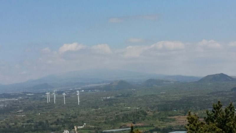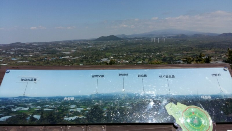 조금 긴 콘크리트와 아스팔트길에 다소 지루한 올레가 저지 오름(239.3m) 한 방에 막혔던 가슴이 시원하게 뻥 뚫린 기분이다. 오르는데 조금 급경사가 있지만 등산해본 사람이라면 식은 죽 먹기다. 제주의 오름이 모두 이런 난이도다. 계단을 올라 저지 오름 전망대에 들어서는 순간 '제주에 이런 곳이 있어?' 하며 탄성이 절로 나온다. 정면의 한라산을 비롯해 아직 가보지 않은 당 오름, 이시돌 오름이 한눈에 확 들어온다. 시야를 남쪽으로 파노라마를 그리면 다녀왔던 산방산과 송악산, 모슬봉과 수월봉 그리고 당산봉이 등장한다. 서북쪽으로 시야를 돌리면 아직 못 본 느즈리 오름, 금 오름이 한라산과 함께 조망된다. 제주에는 크고 작은 오름이 360개라니 오름을 테마로 걸어도 좋겠다. 모처럼 360도 회전 조망을 하는데 그제와 어제 만났던 올레객을 또 만났다. 사람이 귀하니 반갑기 그지없다.