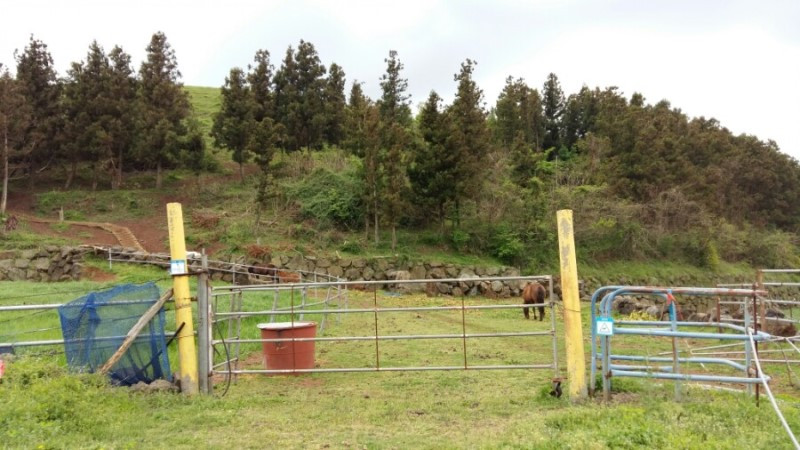 신작로를 따라가다 보면 명성 목장이 나타난다. 더불어 목장 안까지 들어가야 올레를 걸을 수 있다. 이미 올레 기행문에서 목장길 통과 방법을 읽어서 이젠 실행만 남았다. 목장 문을 열고 들어가 말이 목장 밖으로 못 나가도록 문단속을 잘하고 지나간다. 그런데 문도지 오름으로 오르는 경사로 외나무다리가 아닌 외길에서 말 세 마리와 마주쳤다. 말에게 비키라고 말을 거니 말이 말 같지 않은가 보다. 어떻게 한 마리는 지나쳤는데 오르막에 두 놈이 펜이만 바라고 왕방울만 한 눈만 껌벅거린다. 천천히 두 번째 작은 말에게 다가가니 좀 전에 지나쳤던 큰 말이 뚜벅뚜벅 펜이 등 뒤로 다가온다.