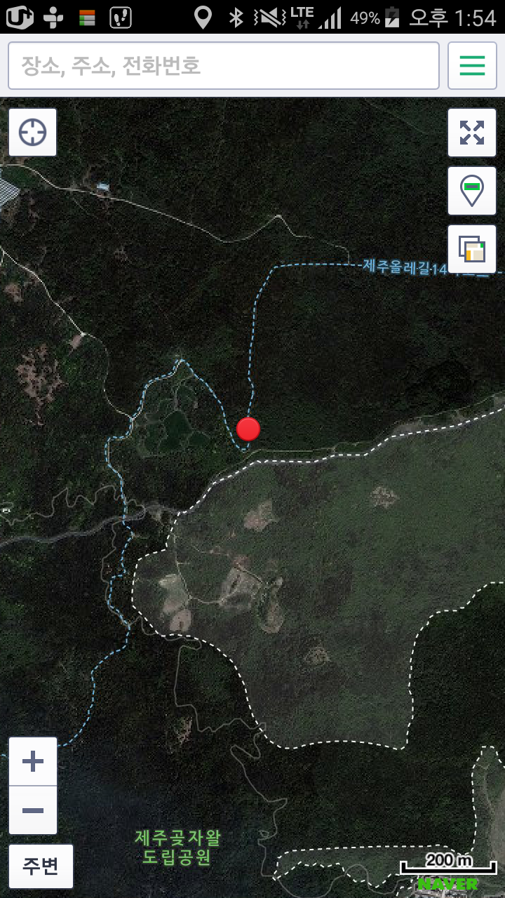 지금까지 보름간 올레를 걸어오는 동안 올레에서 새들이 지저귀는 소리가 없다면 이상할 정도다. 올레의 후유증 중의 하나일 것이다. 지도 앱에서 현 위치의 위성 사진을 보니 온통 시컴하다. 곶자왈이다. 새들의 합주를 들으며 펜이의 서걱이는 발소리만이 들린다. 이 넓은 곶자왈에 숲과 새 그리고 펜이만 있다. 자연과 하나 되는 물아일체의 깊은 명상에 빠져든다. 명상하면서 코끝으로 전해져오는 나무들의 숨결인 은은한 숲 향기에 눈을 지긋이 감긴다. 바위에 앉아 물 한 모금 마시고 새들의 합창을 듣노라면 천지창조 때의 아담이 되는 착각에 빠져든다.