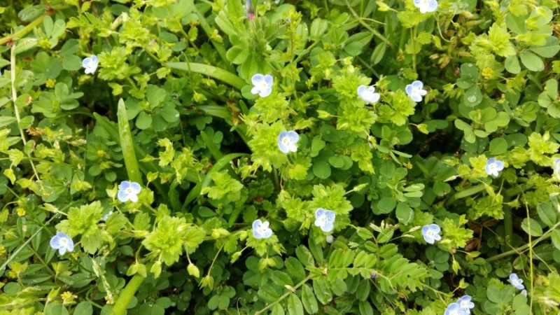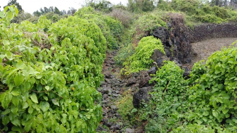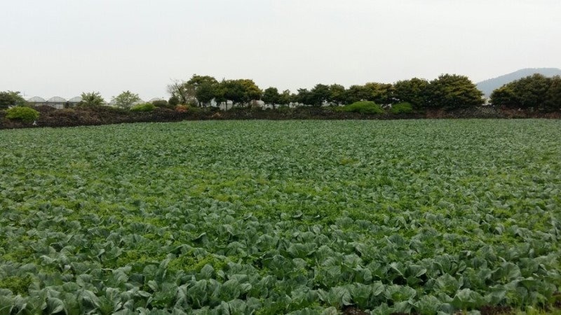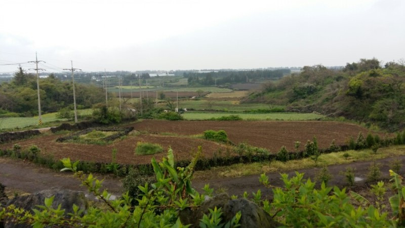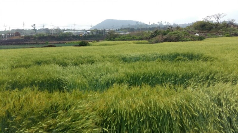 높은 지대에서 마을과 농경지를 보면 마치 조각보를 깔아 놓은 것 같다. 간밤에 비바람이 많이 불었나 보다. 보리가 융단 폭격을 맞았다. 무명천이 나온다. 하천 깊이가 육지 것하곤 차원이 다르다. 조그마한 천인데도 상당히 깊다. 물이 없어 물이 좔좔 흘렀던 강정천과 비교된다. 무명천을 따라 다리를 몇 번 건넌다. 자세히 보니 철저히 포장도로를 피해 숲과 잔디나 풀로 이어지는 비포장길로 코스를 정했다. 올레사무국 관계자의 노력이 돋보인 대목이다. 감사하다.