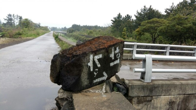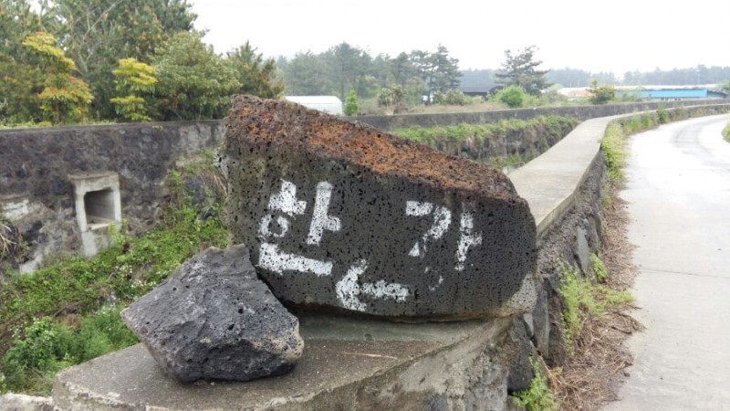 다리를 건너다 글자가 엎어진 돌이 나타난다. '왜 저렇게 써 놓았지?' 하며 뒤를 살펴보니 올바르게 쓰여있다. 참 개구쟁이다. 갯무꽃이 점령한 올레, 비를 머금은 갯무꽃길이 외길이니 지나가야 한다. 그러다 신발과 바지가 쫄딱ㅜㅜ 하지만 스판바지라 5분 만에 OK~ 드디어 중산간 지역 올레가 끝나고 바다가 보인다. 월령 포구다. 이렇게 중산간 지역에서 시작해 바다로 마무리하는 14코스는 숲길과 바닷길 두 개를 맛볼 수 있어 개인적으로 꽤 마음에 드는 코스다.