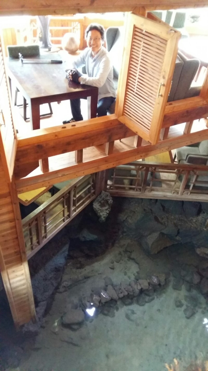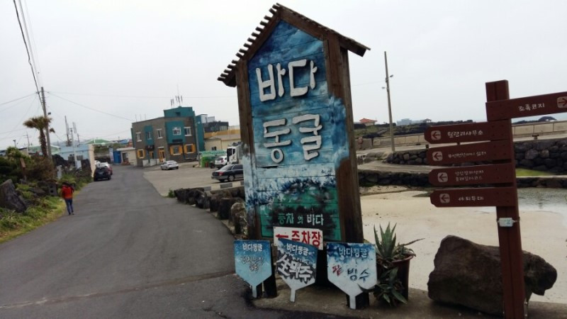 해녀분이 직접 잡은 해산물과 생선을 수족관이 아닌 자연 바다 수족관에 담아 파는 카페, 식사하고 있는데 동네 검은 개가 다소곳이 손님 옆에 앉아서 주는 음식을 받아먹고 한숨 자고 가거나 쥔장 노릇하며 자유스럽게 돌아다니는 카페, 1층에서 지하 바다 동굴을 바라보며 가족과 함께 음식을 먹고 싶은 시원한 카페다.
