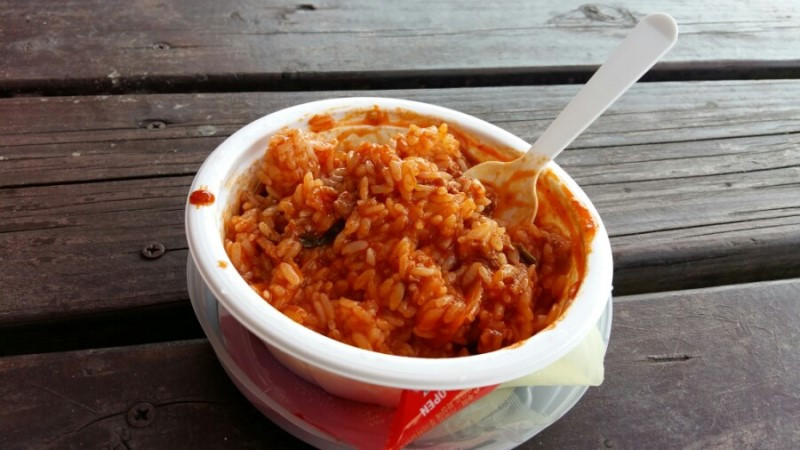 그런데 갑자기 더워진 날씨에 기진맥진입니다. 우여곡절 끝에 중간 스탬프가 있는 CU 편의점에 도착합니다. 그런데 앱에서 뜨던 그 식당 간판이 보이지 않습니다. CU 편의점 점원에 의하면 오래전에 폐업했다고 합니다. 다른 식당도 없답니다. 어떻게 하추자도 신양항에 식당 하나 없단 말입니까ㅜㅜ 편의점에서 빵이라도 먹을까 하다가 진열장에 햇반이 있습니다. 또 다른 포장지를 보니 제육볶음이 있습니다. 라면보다 낫겠지 하고 레인지에 데워 먹습니다. 적은 양이지만 먹을 만합니다. 지금 찬밥 더운밥 가리게 생겼습니까?
