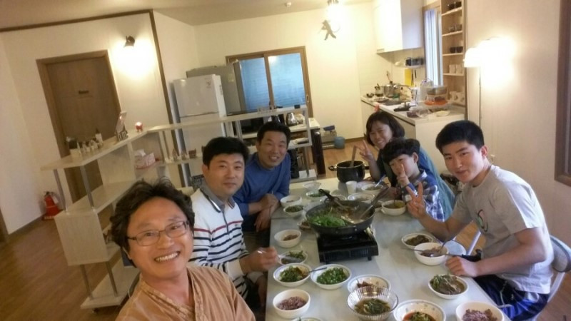 쥔장이 마침 지인을 저녁 자리에 초대했는데 함께 할 건지 묻기에 흔쾌히 승낙했습니다. 목사님과 지인을 초대한 자리였습니다. 올레 걸으며 이렇게 푸짐한 음식을 융숭하게 대접받긴 또 처음입니다. 낮에도 친구 덕에 잘 먹었는데 오늘은 대접받는 날인가 봅니다. 음식을 대접받으며 알게 된 사실입니다. 건물을 리모델링해 게하를 오픈했는데 지인이 두 번 자고 펜이가 첫 손님이라는 것입니다.