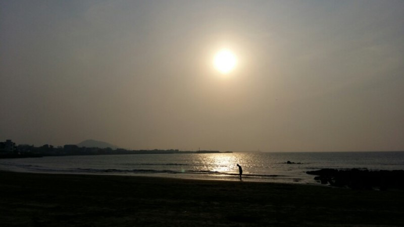 곤을동 4.3 유적지를 지나 화북 포구에서 낚시꾼들의 유혹을 뿌리치고 숙소가 있는 삼양검은모래 해변에 도착합니다. 진짜 모래 색깔이 검습니다. 희고 노란 모래는 봤어도 검은 건 처음 봅니다. 여름철이면 검은 모래찜질이 신경통에 좋다고 합니다. 때마침 석양을 먹은 바다는 물비늘로 가득 찹니다. 눈부신 바다와 검은 모래가 어우러져 작품이 됩니다. 줄기차게 폰카를 누릅니다. 펜이만 보기에 아쉬워 가족에게 카톡으로 자랑질합니다. 물론 매일 작성한 글을 톡으로 공유하지만 말입니다. 석양의 해변에서 50대 후반이 소년처럼 즐거워합니다.
