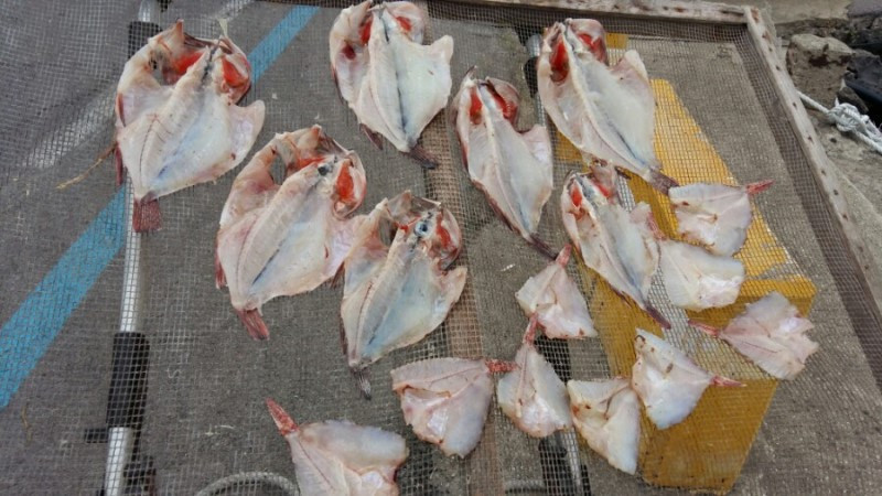 우도에서 말리는 검은 우뭇가사리를 봤는데 이곳 신촌 포구에서도 볼 수 있습니다. 여기 것은 주황색과 붉은색입니다. 점차 건조되면서 검은색으로 변하는지 모르겠습니다.