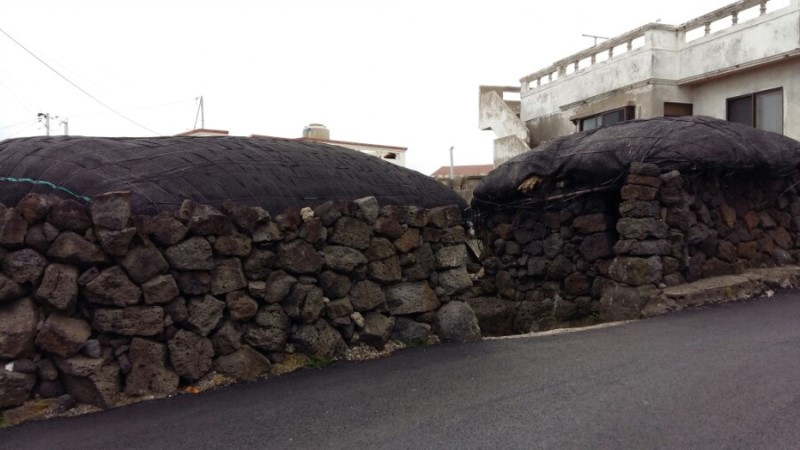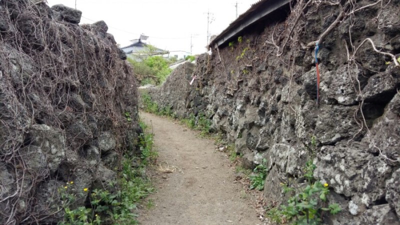 어느덧 마을로 접어들면 제주 고유의 돌담이 그대로 남아 있는 곳 많습니다. 바람이 많으니 지붕을 새끼로 동여맨 집들도 보입니다. 바닷가 올레를 걷다 보면 남탕, 여탕 글씨를 자주 봅니다. 노천탕이 있는 동네가 있습니다. 한라산 자락에서 지하로 흘러나오는 민물이 바닷가에서 솟은 물인 용천수를 활용한 것입니다. 남탕과 여탕이 따로 있는데 여름 제철이 아니라서 다행히 금남의 집 여탕에 들어가 볼 수 있었습니다.