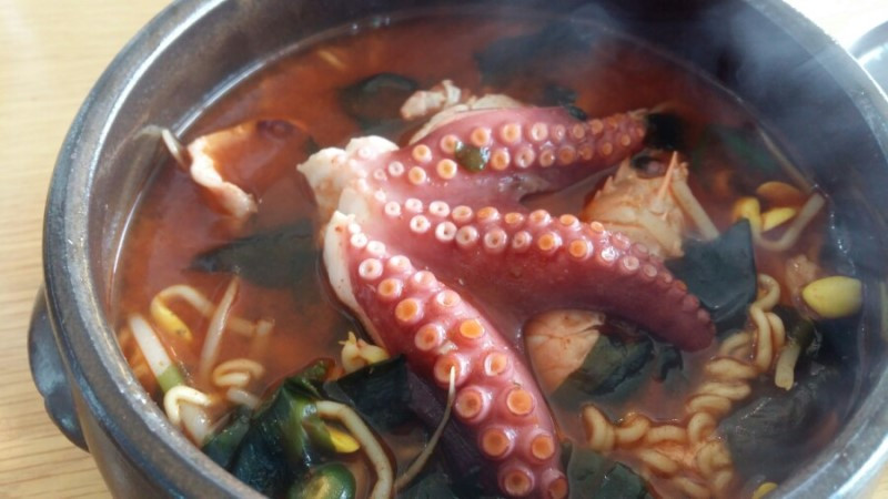 ㅈ메뉴는 문개집이니 당연 문어 라면입니다. 문어가 발 3개를 늘어뜨리고 어서 잡숴봐요~ 하는 것 같습니다. 문어만 든 게 아니라 딱새우, 꽃게, 조개 등 해산물이 들어 있어 빨간 국물이 시원합니다. 화순 금모래 해변에서 먹은 해물 라면만큼이나 맛있습니다. 한라봉 아이스크림을 후식으로 먹으며 뷰 좋은 바다를 바라보는 호사와 여유를 부려봅니다.