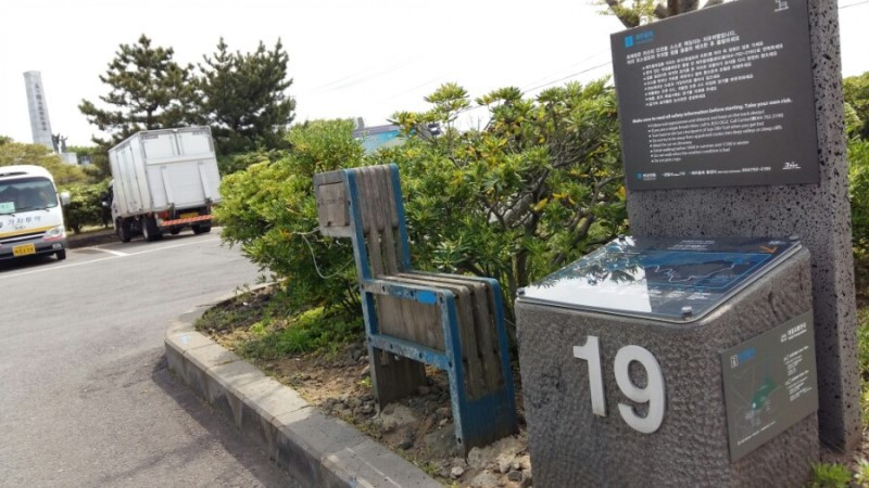 아기를 대동한 올레 부부를 서우봉에서 만나 앞서거니 뒤서거니 하다 결국 종점에서 간발의 차로 스탬프를 찍었습니다. 그들은 안식처로, 펜이는 함덕의 사우나로 갈 때도 같은 버스를 탔습니다. 2010년부터 시간 날 때마다 올레를 찾는다는 젊은 부부. 19코스 중간 지점 동복리 마을 운동장에서 스탬프 찍을 때 본 그들의 올레 패스포트는 펜이 것과 달랐습니다. 펜이 것은 청색 합본인데 그들의 것은 청색과 주황색 2권으로 지나온 세월을 말해줍니다. 그들의 따스한 물과 펜이의 커피가 만나 짧은 휴식을 만듭니다. 세 살의 어린 나이에도 잘 따라다니는 사내아이를 둔 부부. 부부가 서로 번갈아 가며 아이를 업고 다니는 모습이 정겨웠던 그들. 아이를 데리고 19코스 19km를 완주하는 그들은 진정 올레를 사랑하는 사람들입니다. 수도권에서 온 젊은 부부를 만난 것도 30km라는 장거리를 걸을 수 있는 원동력이었습니다. 정작 같은 버스를 탔어도 만원 버스라 내릴 땐 아쉬운 작별의 인사도 못 나눴습니다.