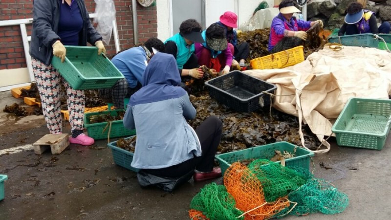 시끌벅적한 곳에 당도합니다. 한가득 쌓은 미역을 손질하는 아낙네들의 수다와 바쁜 손질이 사람 사는 맛이 납니다. 길손은 알아듣지 못할 외국어와 바쁜 손길 그리고 아줌씨들의 숫자에 짓눌려 말 한마디 못하고 스칩니다. 함덕 포구 사람들입니다.