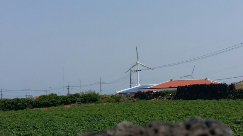 텐트촌을 뒤로하고 잔디가 많아 이름 붙어진 '성세기 태역길'을 걷는데 갑자기 위압감을 느낍니다. '태역'은 잔디의 제주어입니다. 오른쪽에 상상할 수 없는 커다란 거인이 거대한 바람개비를 돌리며 윙~윙~~위협합니다. 풍차단지는 아직 멀었는데 여러 개의 풍력발전기의 위용에 주눅이 들 정돕니다.