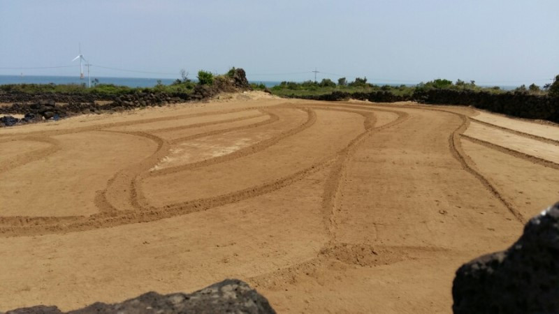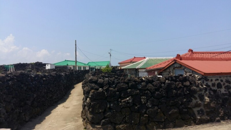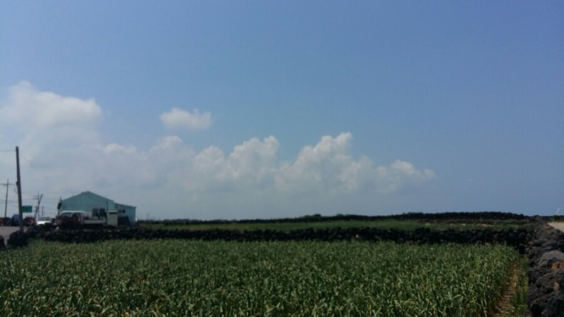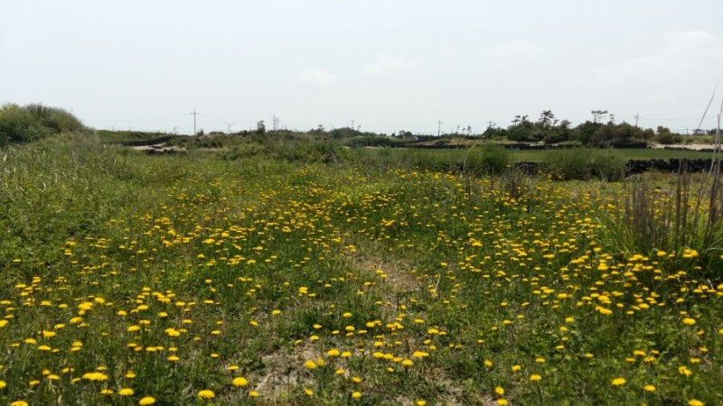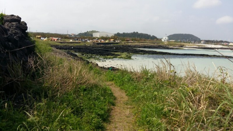아침을 늦게 먹어서 점심도 늦게 먹을 요량으로 식당이 많은 월정 해변과 행원 포구를 지나쳤습니다. 한참 마을 안으로 접어들어 밭과 숲을 보면서 구좌농공단지를 지납니다. 목이 말라 나무 그늘에 쉬면서 중간 스탬프를 올레책에서 찾습니다. 아... 약 2km를 지나쳤습니다. 왕복 4km입니다. 완주가 목표이기에 어떡합니까... 빠꾸토 해야지요. 좁고 표면이 불규칙한 올레 대신 농공단지의 직선 포장도로로 광해군 기착지까지 꼬닥꼬닥(느릿느릿의 제주어) 걸어갑니다.