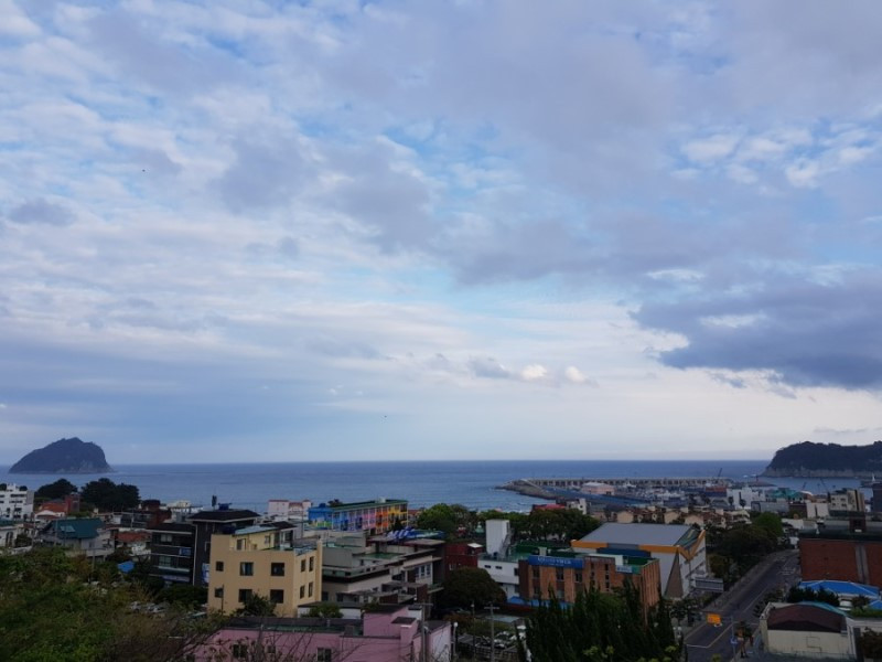 창밖 건물 사이로 보이는 서귀포항 바닷가 풍경은 한가롭기 그지없다.