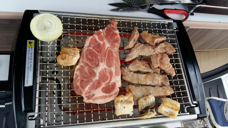 기회를 아침으로 돌리고 전기그릴에 고기를 구웠다.