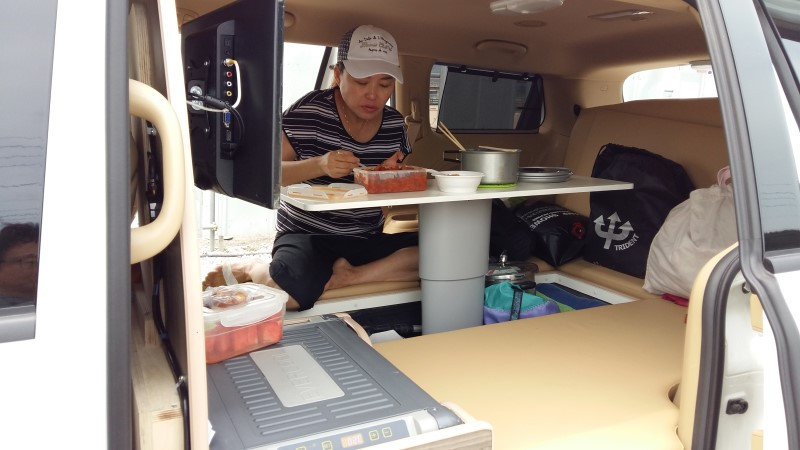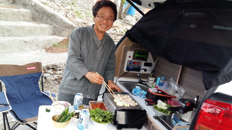 사이드 문과 트렁크를 열고 식사를 준비하니 오고 가는 사람들이 모여들었다.