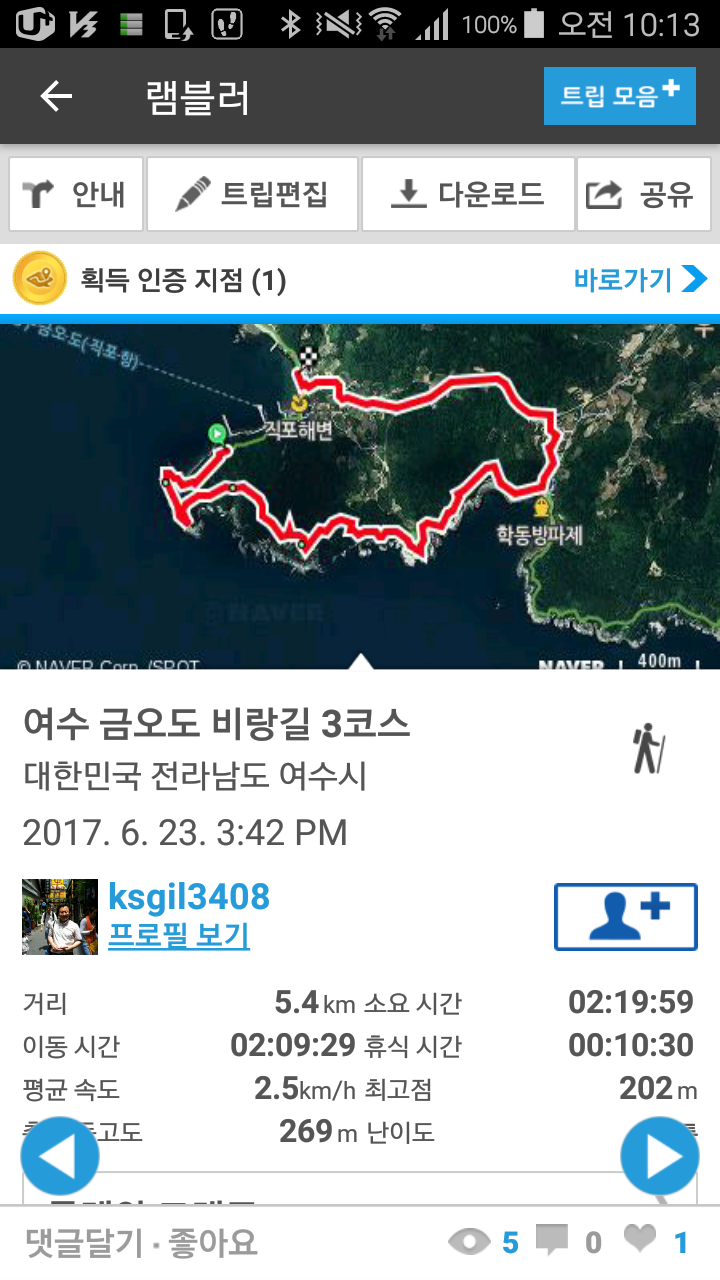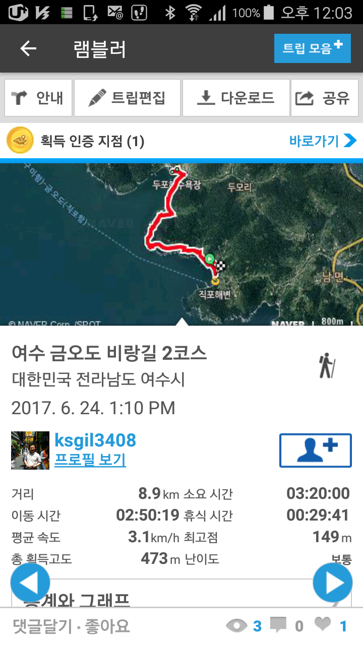 오전은 휴식을 취하고 오후에 2코스(두포~직포, 3.5km, 1시간 소요)를 역주행했다.