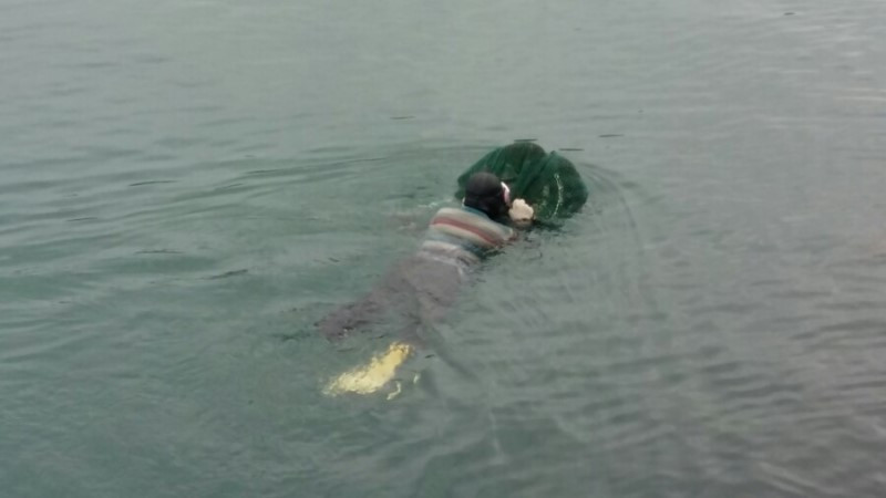 한참 물고기가 아닌 바늘과 시름 중에 누군가 바닷물 사이로 유유히 지나간다.