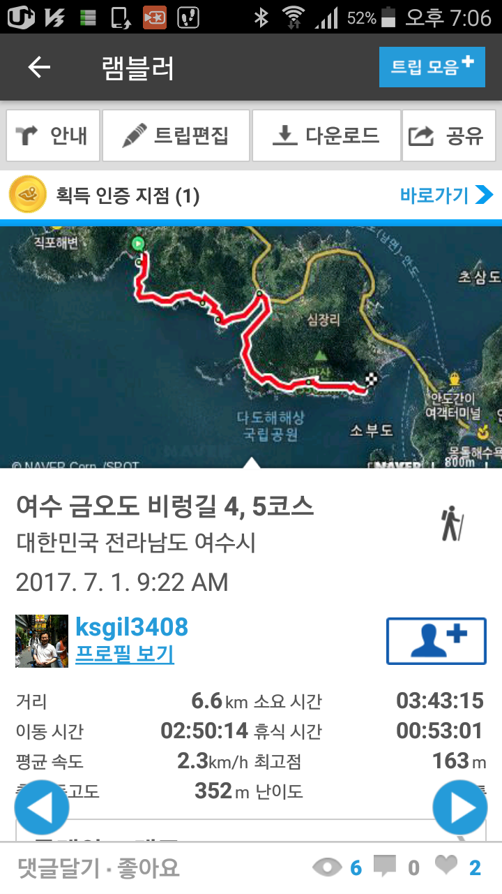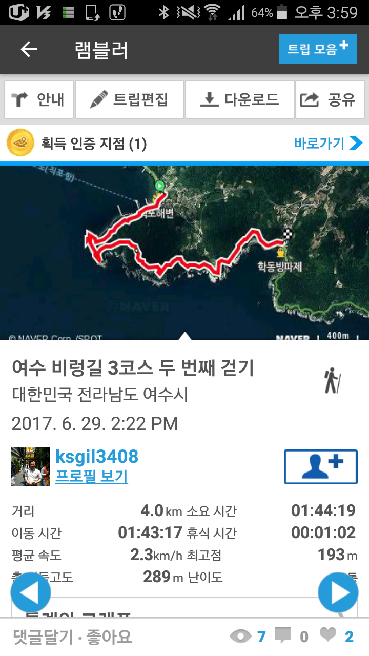 비렁길 3코스(직포~학동) 약 4km를 약 1시간 40여 분 걸렸다.