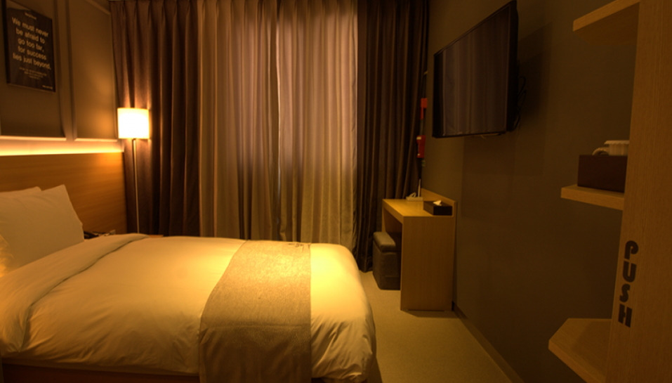 [무대 조명이 반쯤 켜진다. 무대 왼편은 트윈룸, 오른편은 싱글룸이다. 두 방 모두 인테리어가 거의 흡사하다. 짙은 갈색 카펫이 깔려 있고, 하얀 침대의 2/3 아래 지점을 길게 가로지르는 자줏빛 침대 덮개가 가지런히 놓여 있다. 베개나 쿠션도 덮개와 같은 색의 커버가 씌워져 있다. 내부 조명은 백열등보다 더 오렌지 계열의 채도가 묵직하게 감도는 빛을 자아낸다. 커튼이 창을 완전히 가리고 있어 내부는 더 어둡게 느껴진다. 오른편(싱글룸)으로 향하는 주인공이 커튼을 활짝 연다. 바깥에선 이렇다 할 빛이 보이지 않아서 분위기가 한층 더 을씨년스러워진다]