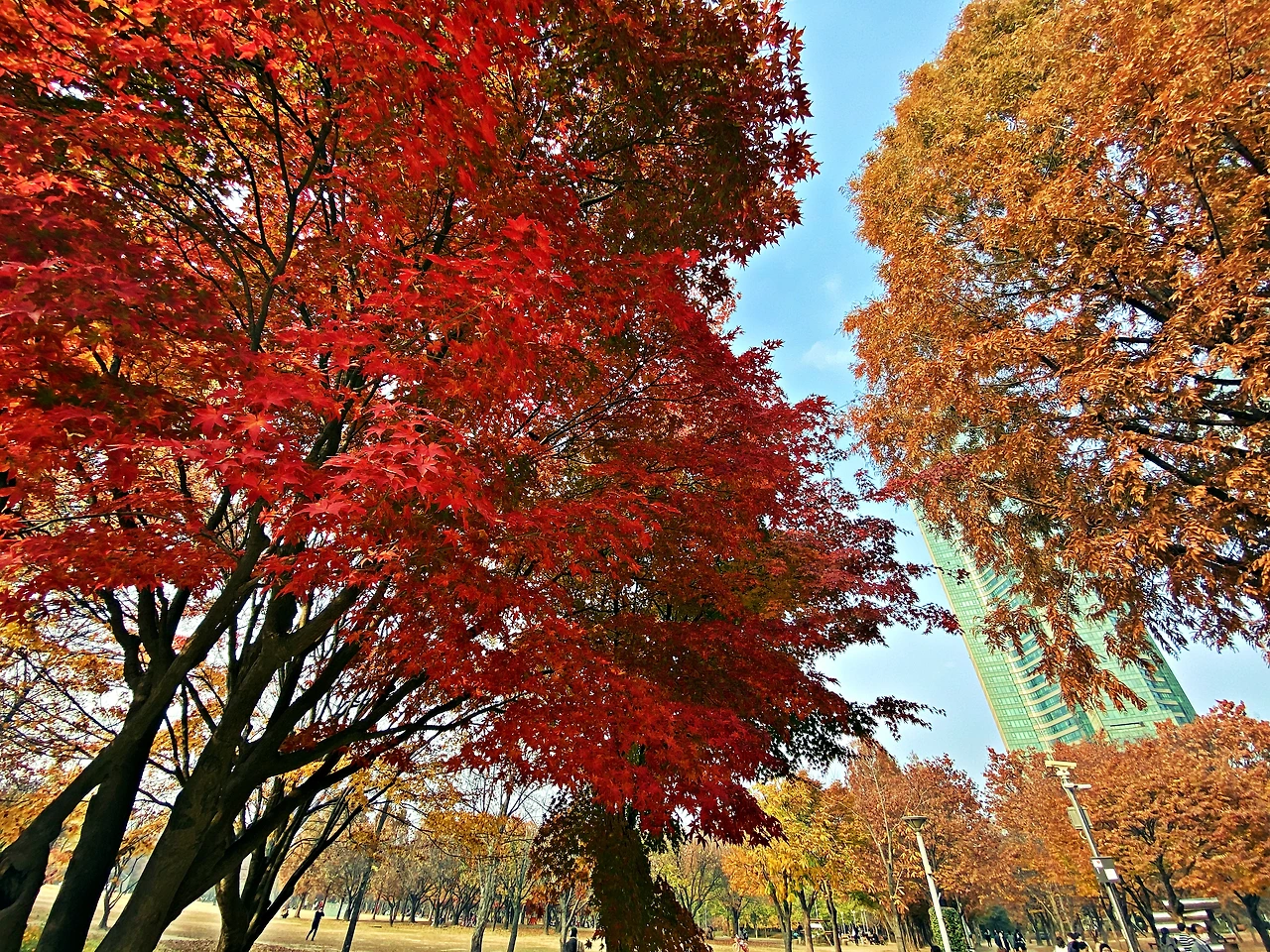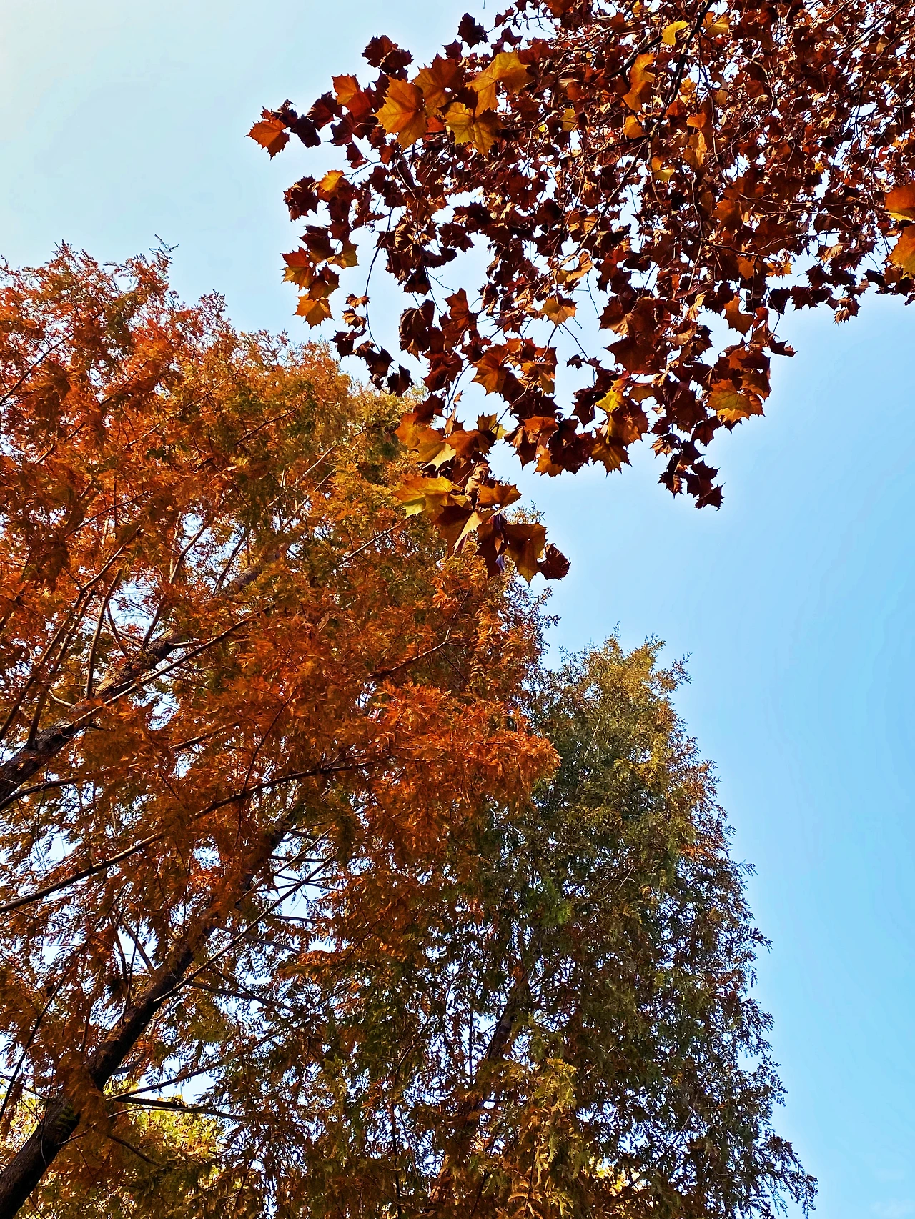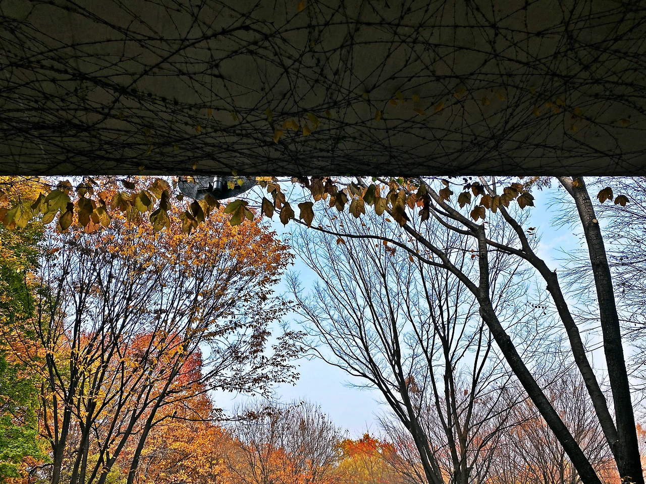 푸르스름한 하늘의 여백은 노르스름하고 불그스름한 나무가 채운다. 푸른 나뭇잎, 푸른 하늘을 조금 쓸쓸해 보이도록 보정한 사진도 투척. 상록수인지는 모르겠지만, 여전히 초록 잎사귀가 달린 나무도 보인다.