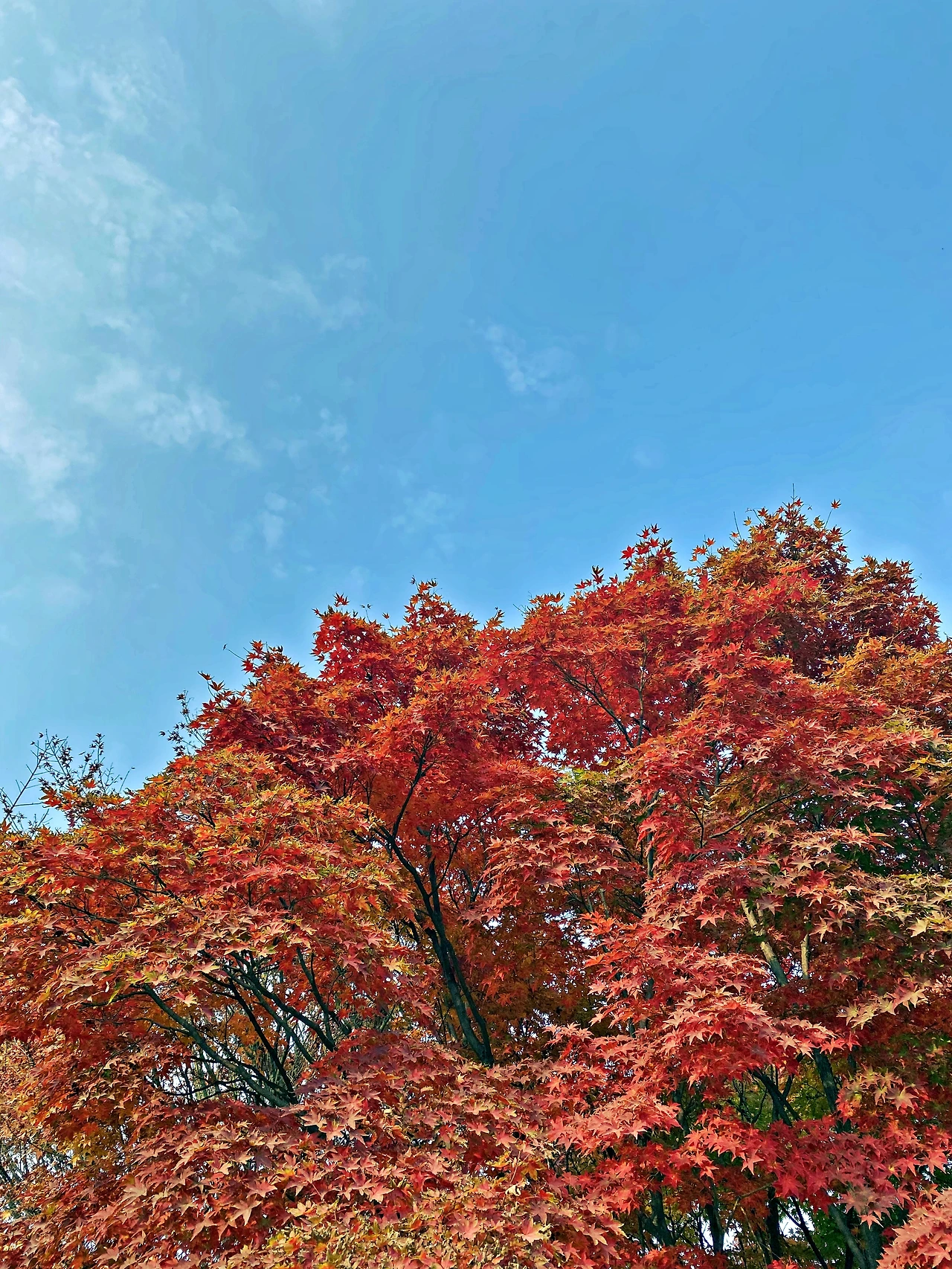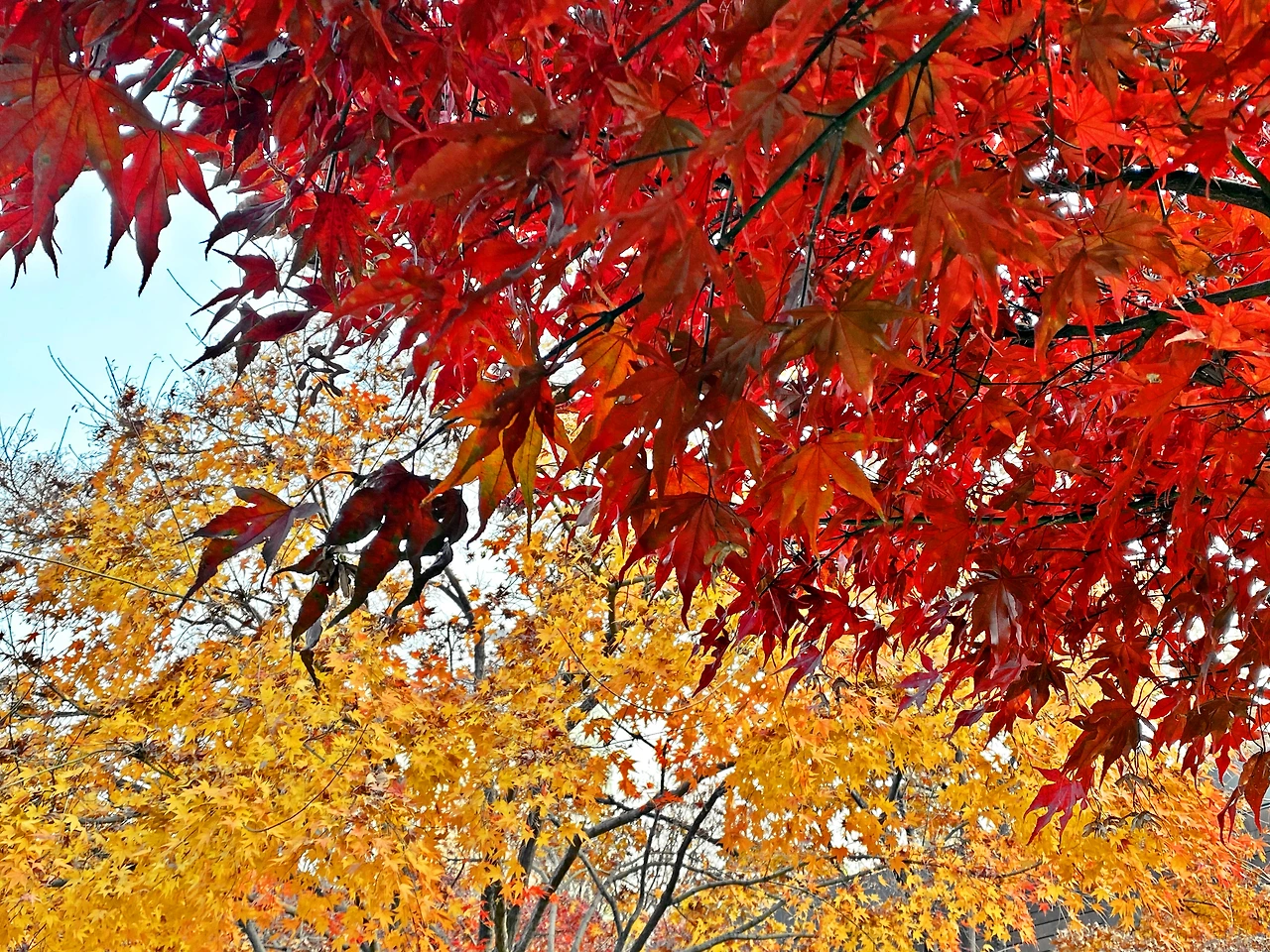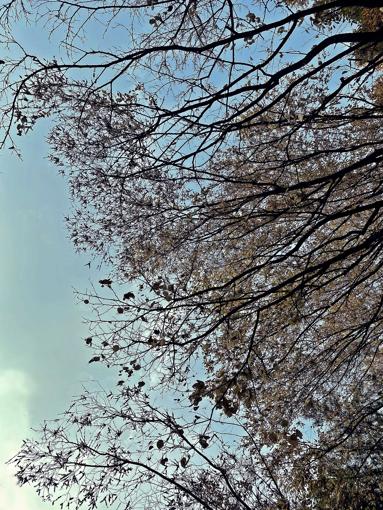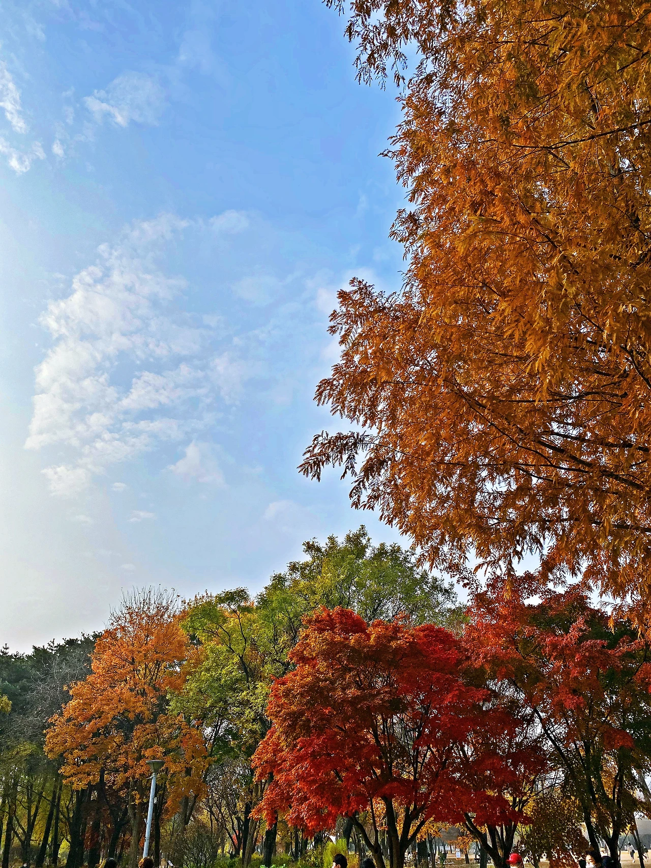 푸르스름한 하늘의 여백은 노르스름하고 불그스름한 나무가 채운다. 푸른 나뭇잎, 푸른 하늘을 조금 쓸쓸해 보이도록 보정한 사진도 투척. 상록수인지는 모르겠지만, 여전히 초록 잎사귀가 달린 나무도 보인다.