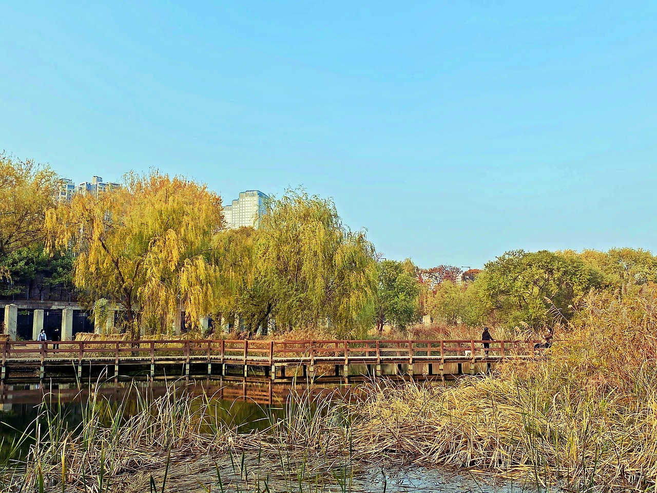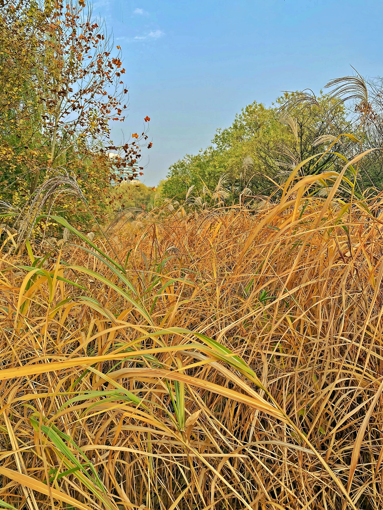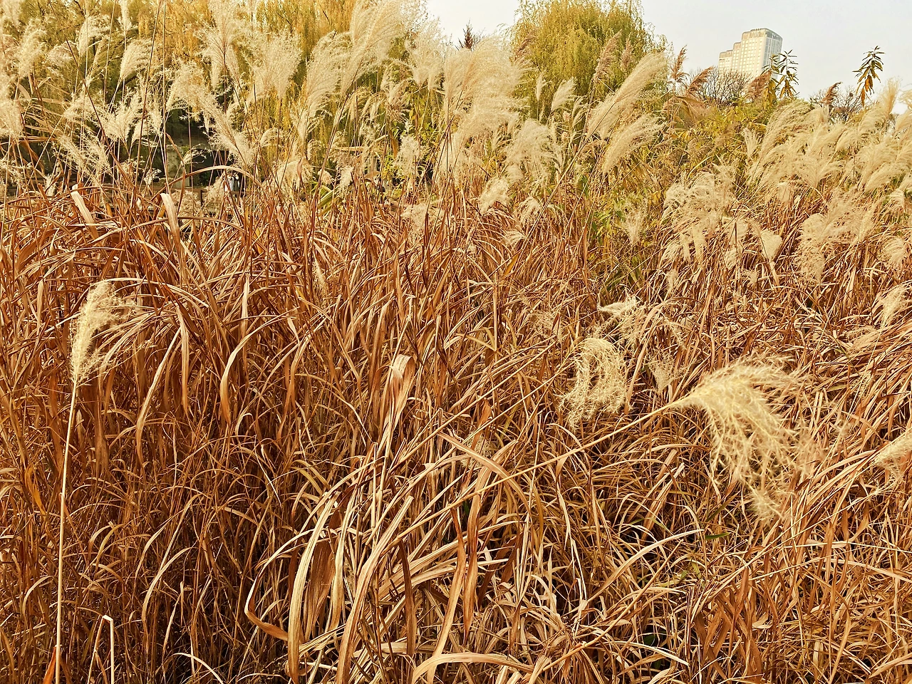 은행나무 숲을 나와 길 따라 걸으니 갈대로 둘러쌓인 데크가 이어졌다. 역시 갈대는 '노르스름' 카테고리에 어울린다.