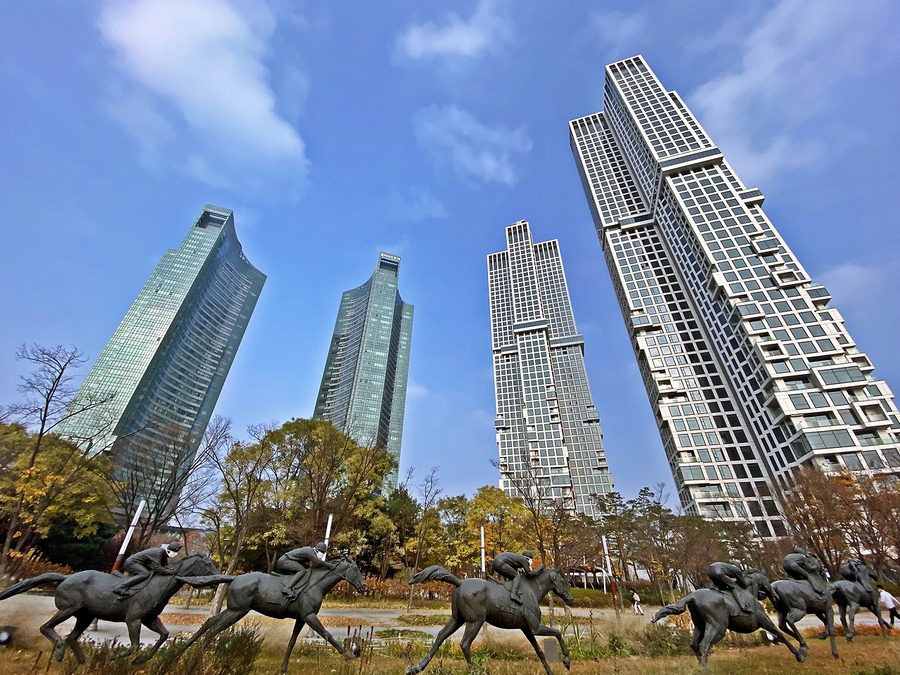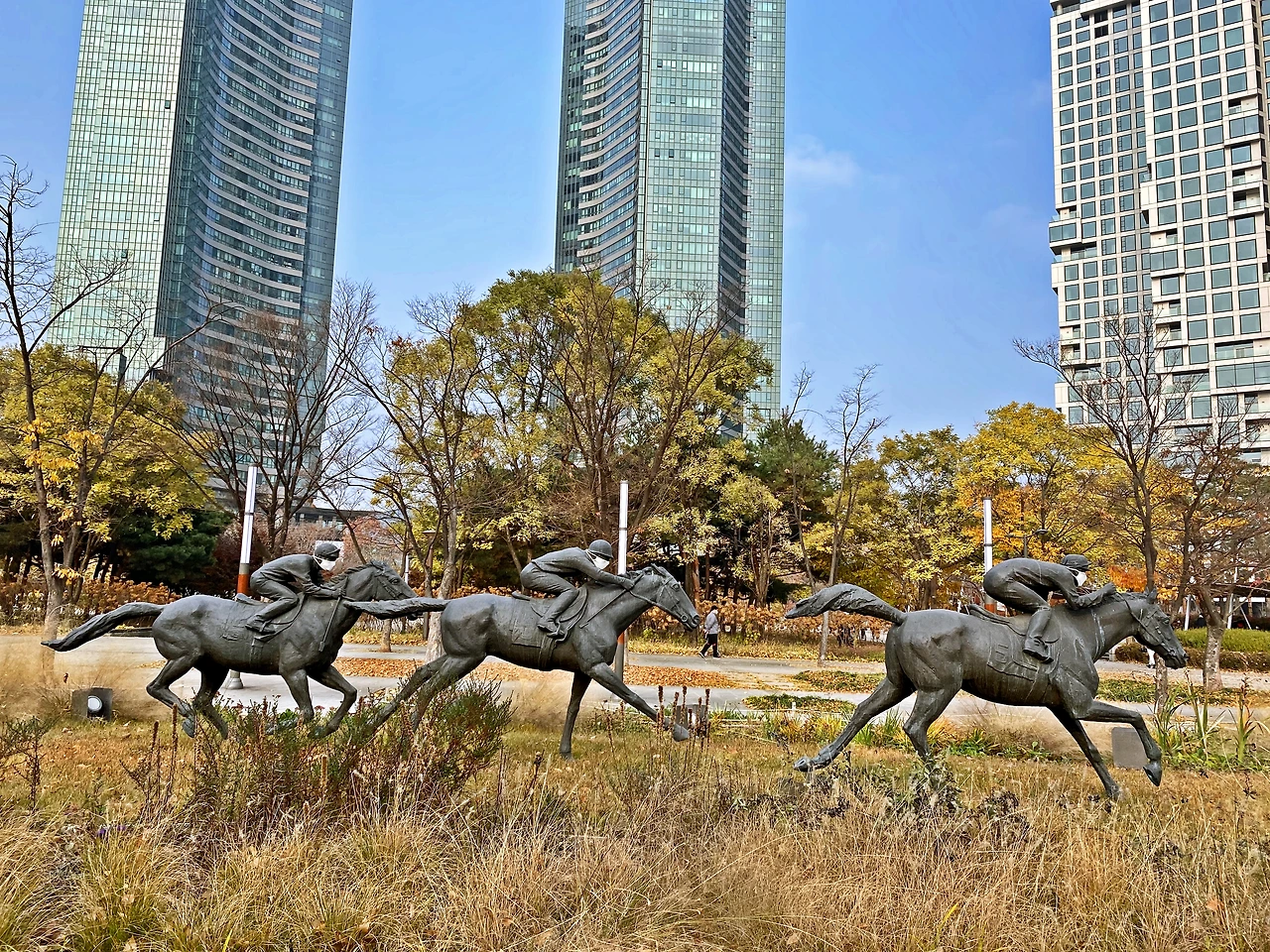 서울숲 입구. 기마상의 기수들도 마스크를 착용하고 있다.