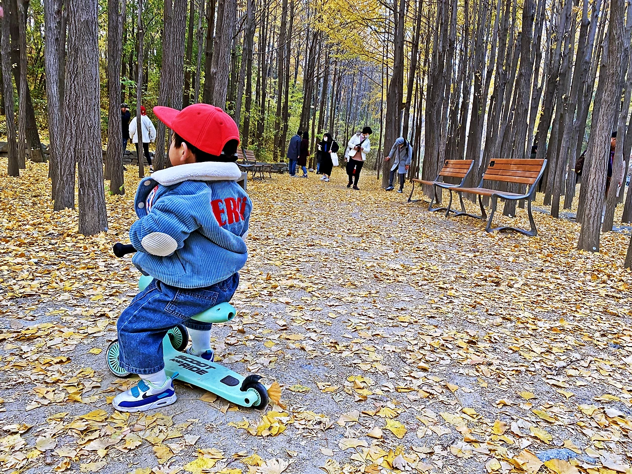 우리 앞에 멈춰서서 포즈를 취하던 아이. 마침 빨간 모자를 써서 노르스름한 은행 길 위에 불그스름한 모자 한 점을 얹었다.