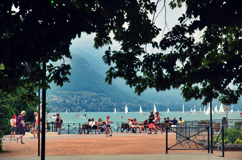구글맵상의 도시의 면적과 안시 호수의 면적은 비슷하게 보일 만큼 호수는 컸다. 과연 호수의 도시답다. 광활한 호수의 면적을 사람의 시선에서 보니 바다와 다를 게 없었다. 물론 바다에 맞닿은 휴양지와는 사뭇 다른 느낌이다. 어딘가 애매한 휴양지의 느낌이랄까. 날씨라도 쨍했다면 좀 더 휴양지 같았으려나. 간만에 자연을 찾은 여행자를 아랑곳 않고 먹구름은 호수 위에 자꾸만 그늘을 드리웠다. 이따금 먹구름이 지나가버린 찰나에 호수의 풍광이 밝아진 건 다행이었다.