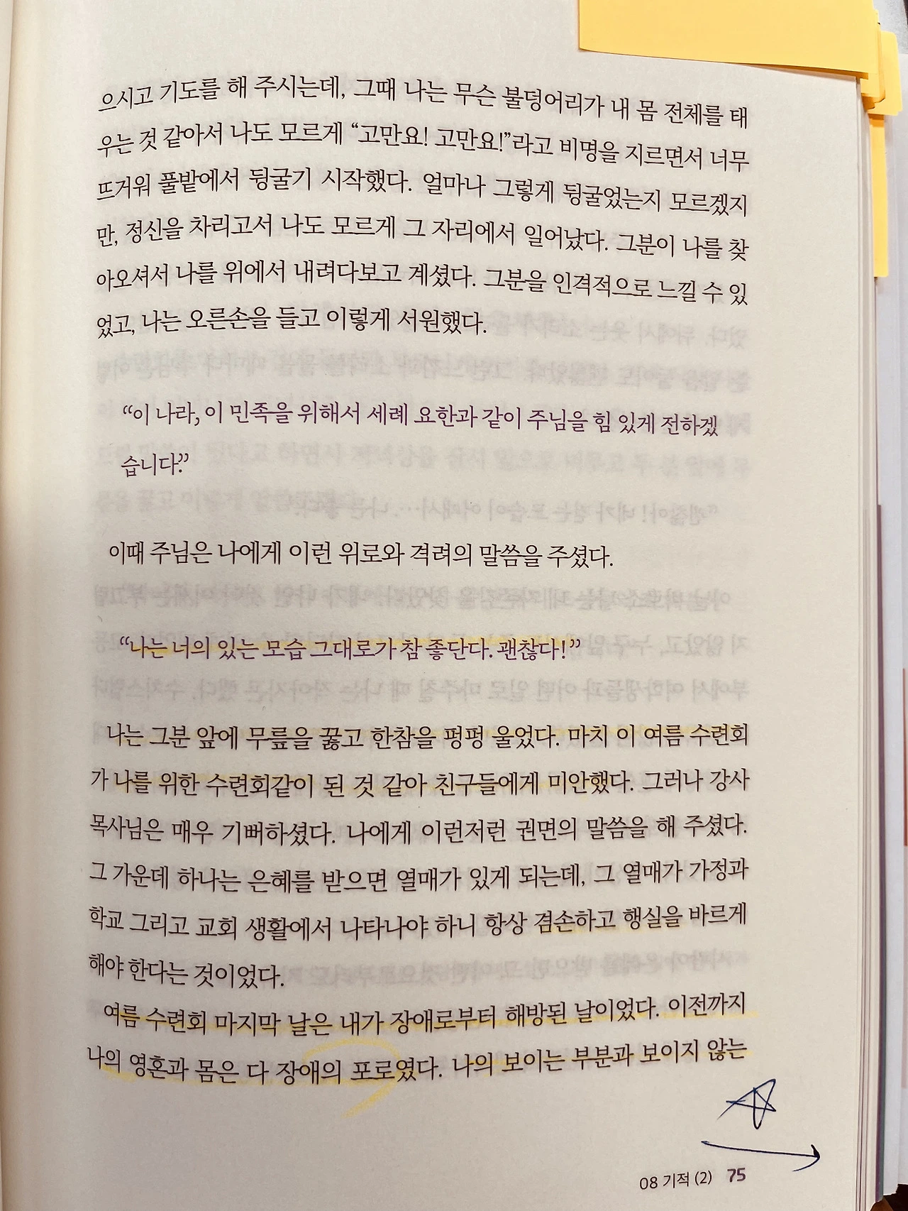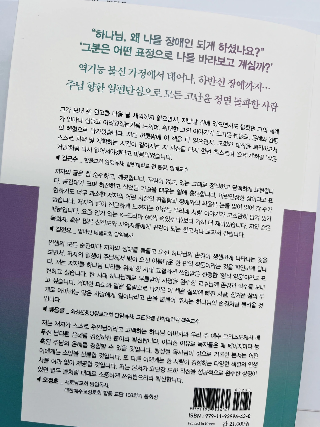 저자의 ‘네 살’은 평생 장애로 살게 하는 낙인을 찍는 해였습니다. 처절한 고통으로 울부짖는 어린 황성철의 그 날, 그 눈물과 울음은 미래의 수많은 광야 같은 생활을 예견하는 듯 합니다. 자신으로 인해 부모의 갈등이 유발되고, 아버지의 어머니를 향한 역정과 또 자신을 향한 어머니의 한맺힌 매질, 그런 날이면 자신을 붙들고 한없이 우시는 어머니! 그럼에도 저자의 부모님은 한평생 정직과 성실로 가정을 든든히 세워가셨고, 특별히 교육에 대한 열의가 깊었습니다. 비가 오나 눈이 오나 국민학교 6년의 어머니의 등은 유일한 교통 수단이었습니다. 부모님의 등에 업힌다는 건 행복 자체여야 할텐데, 저자에게는 손가락질과 조롱을 받는 시험대와 같은 곳이었습니다. 성적이 매우 우수했지만, 장애에 대한 편견은 중학교와 대학교 입학에 큰 좌절을 맛보기도 했습니다.