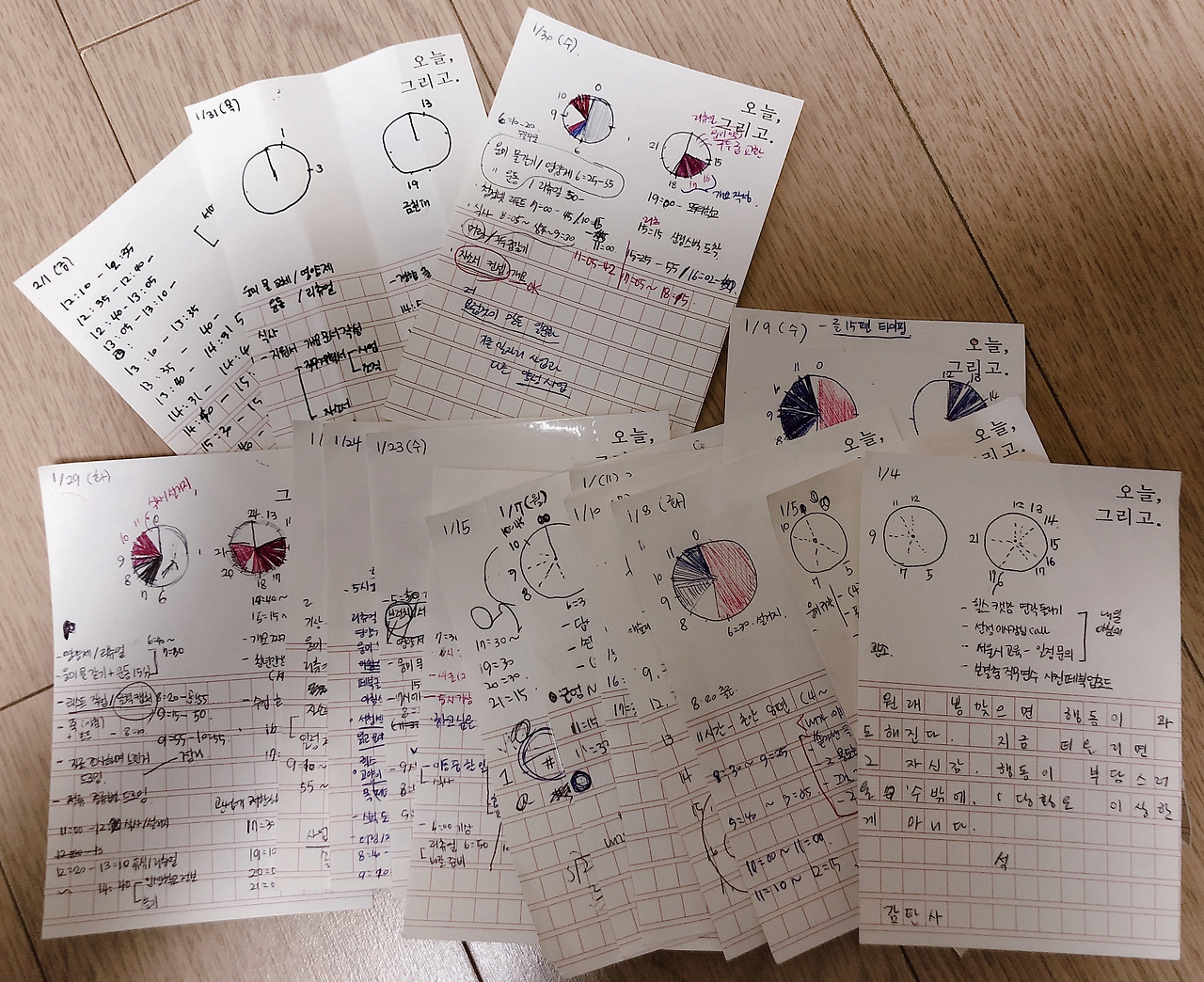 <오늘, 그리고.> 종이에 원 시계 그림을 그리고 집중해서 일한 시간을 색으로 표기, 말일에는 집중한 시간 숫자 기록만 남기기도.