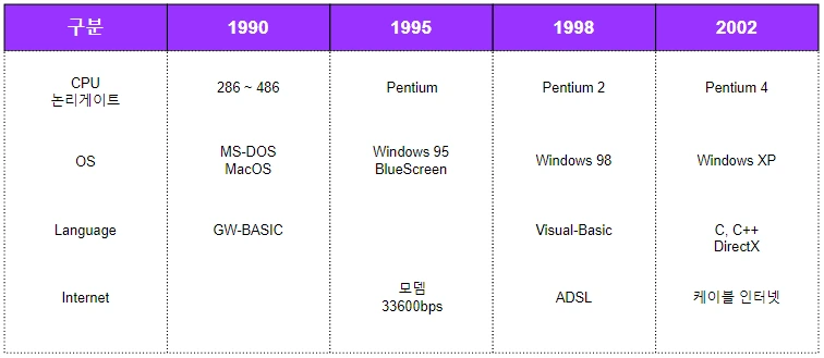 (년도는 출시보다 보급화 기준으로 되어 있는 점 참고 바랍니다.)