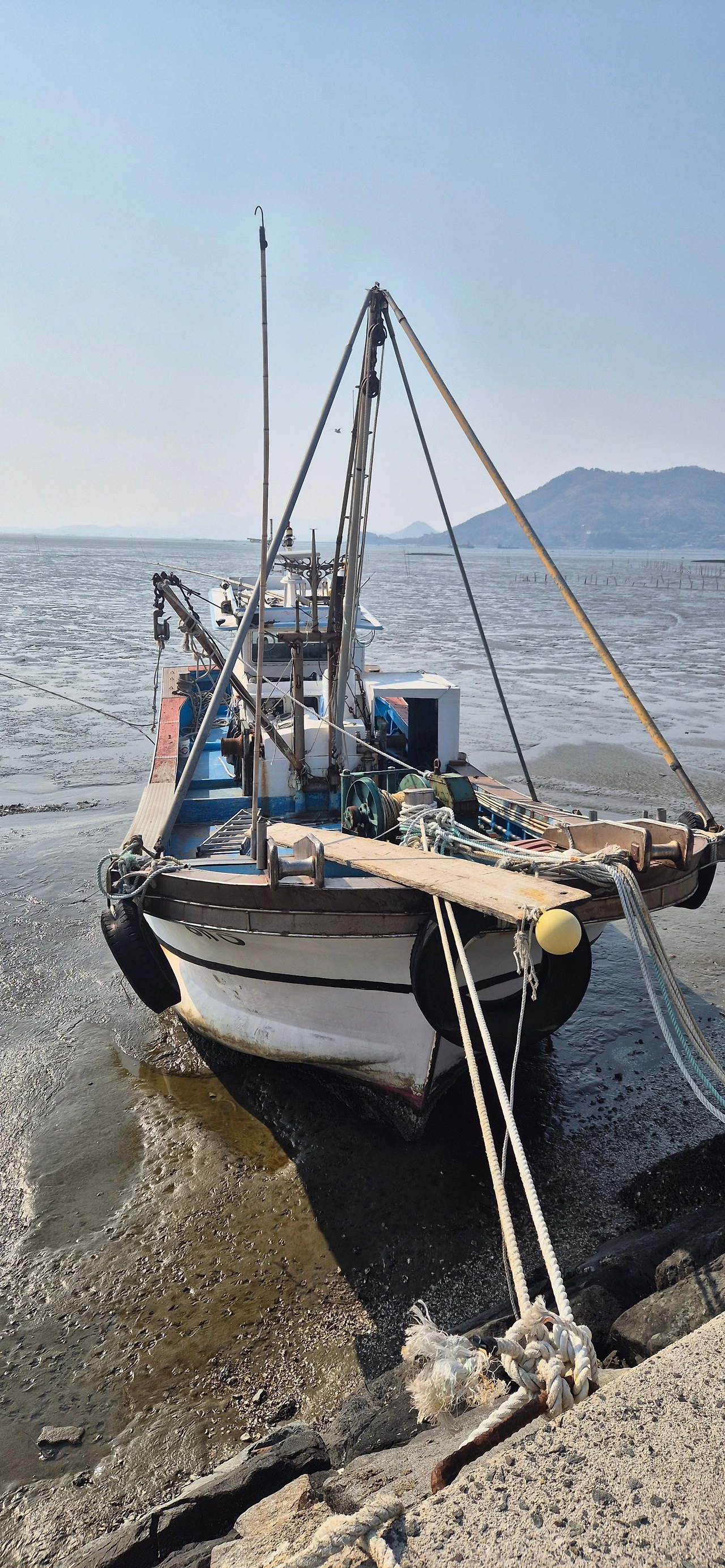 갯벌 위에 앉아있는 낡은 어선