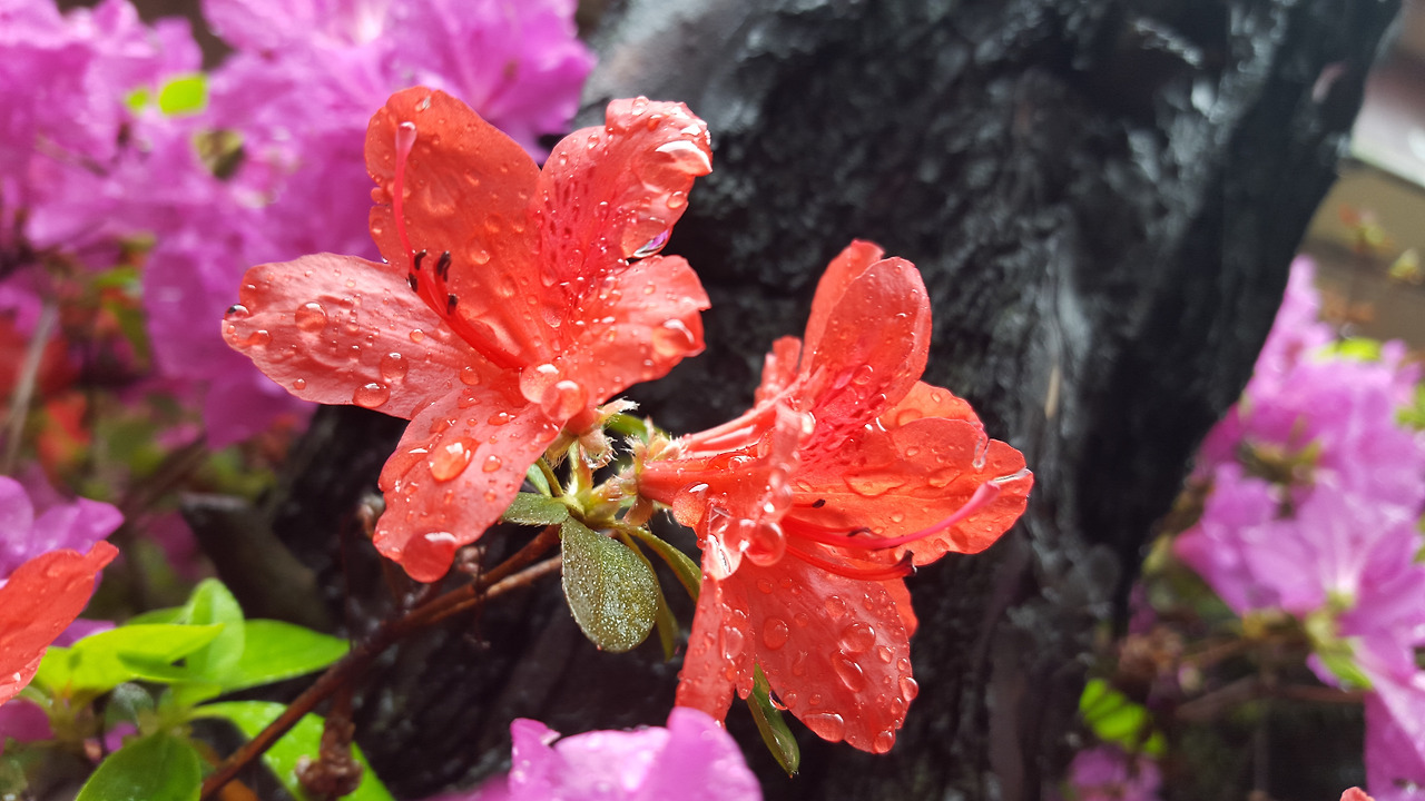 빠알간 철쭉이 비를 잔뜩 묻혀