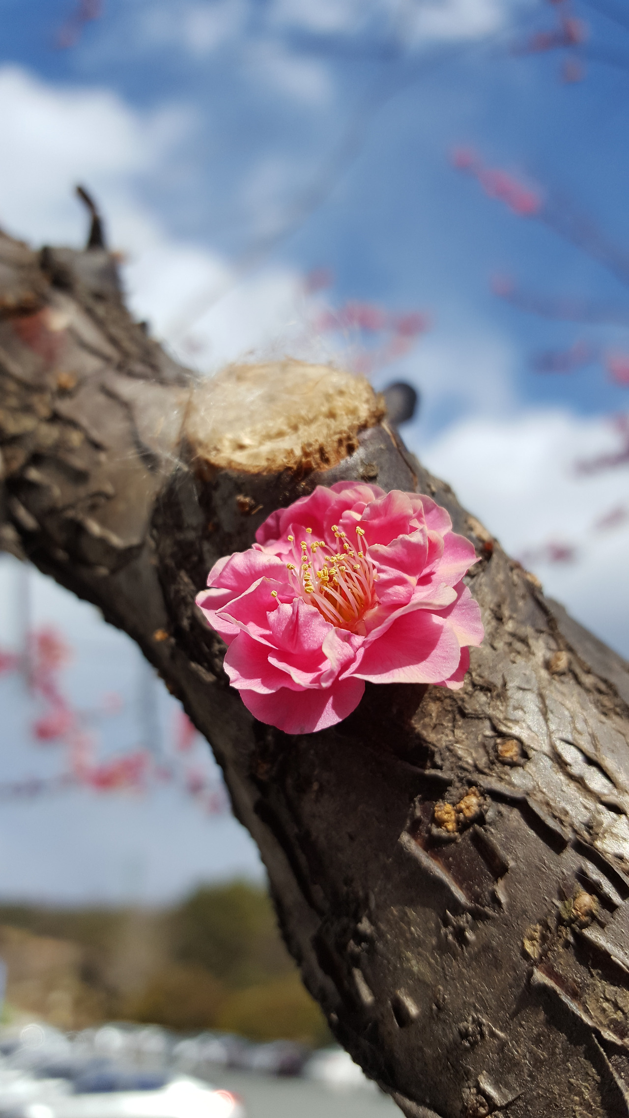 홍매화 두 송이 나란히 그루터기 밟고 앉아