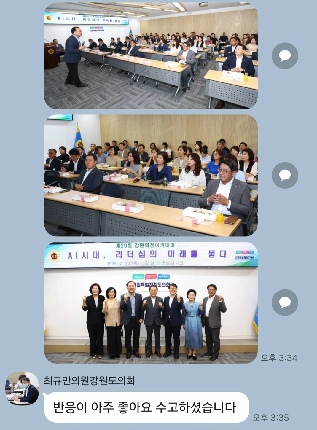 어제 강원의정아카데미 특강을 마치고 나오는데, 한 의원이 다가와 여태까지 강의 중 가장 좋았다며 인사를 한다. 아는 의원도 반응이 아주 좋았다며 감사의 카톡을 보내온다. 회기 중이라 그 바쁜 가운데 오찬 세미나를 통해서라도 더 배우려는 의원들을 보니, 잔잔한 감동과 강원도의 힘과 품격이 느껴진다.